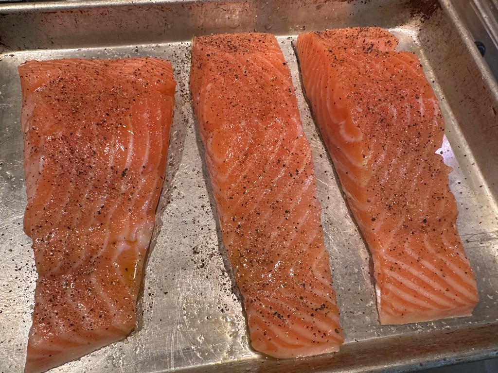 We purchased one large piece of salmon portioning it down to three 8-ounce pieces. For an even heftier meal, add some canned chickpeas, white beans or black beans (we opted not to). To finish, the vibrant tang of the bright ginger-scallion vinaigrette balances the richness of the roasted salmon.