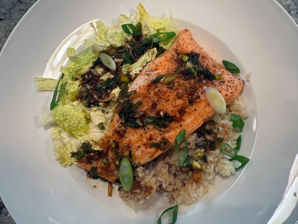 Roasted Salmon with Miso Rice and Ginger-Scallion Vinaigrette