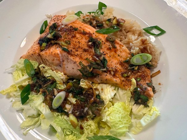 This NYTimes Cooking recipe appealed to us on several fronts. First, we love salmon, are fond of Asian cuisine and liked the idea that dinner was ready in only 30 minutes or so.