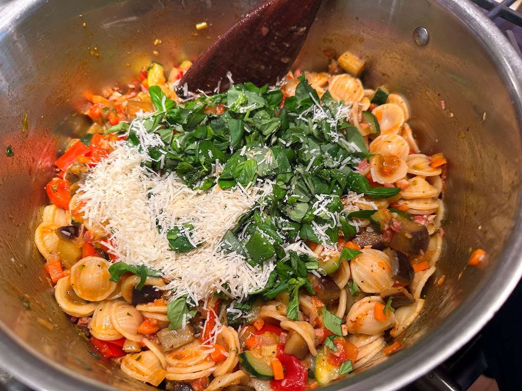 4. 04To the mixture in the Dutch oven, add the tomatoes, marjoram and ½ cup pasta water. Bring to a simmer over medium and cook, uncovered and stirring, until a wooden spoon drawn through leaves a trail, 5 to 6 minutes. Add the pasta and vegetables; cook, stirring, until heated through, 2 to 3 minutes. Stir in the basil and Parmesan; add additional cooking water as needed if the mixture looks dry. Taste and season with salt and pepper. Serve topped with ricotta, additional oil and additional Parmesan.