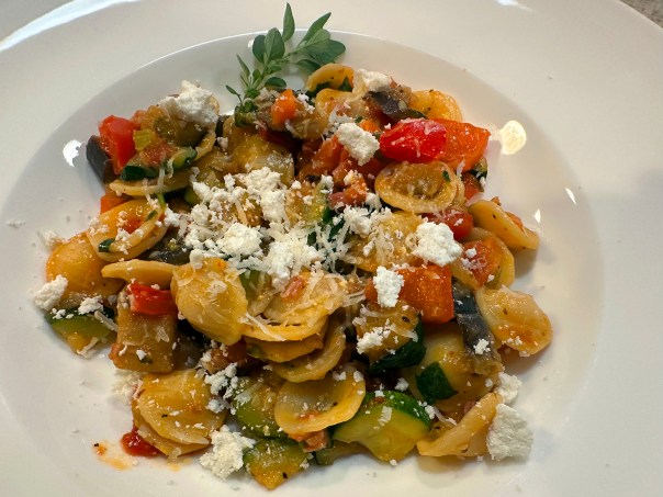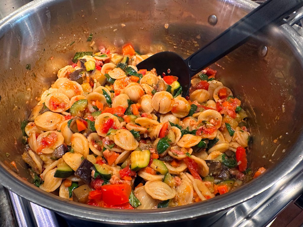 The sauce traditionally is paired with a handmade ring-shaped pasta called anellini. In its place, store-bought orecchiette is used , which does an excellent job of catching chunks of the rustic sauce.