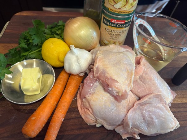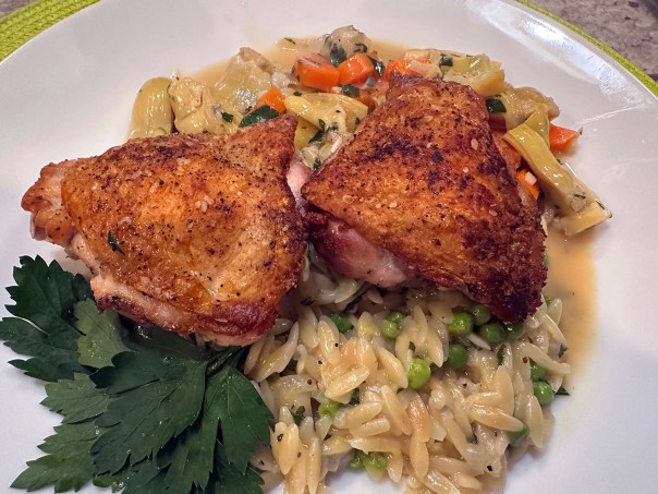 Maybe you have never of Artichauts à la barigoule, a classic Provençal braise that combines fresh artichoke hearts with aromatic vegetables, herbs and white wine. If not, this recipe is worth a try. Here, chicken thighs are seared on the stovetop and while they finish cooking in the oven, canned artichokes are used to put together a simplified barigoule that serves as both a vegetable accompaniment and a flavorful sauce.