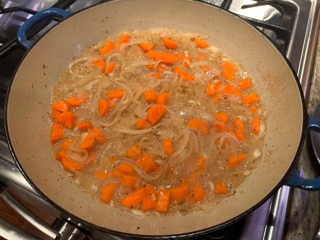 2. While the chicken roasts, pour off and discard all but 1 tablespoon fat from the skillet. Set the pan over medium and melt 2 tablespoons of butter.Add the onion, carrots and ¼ teaspoon salt and ½ teaspoon pepper, then cook, stirring occasionally, until the onion is translucent, 3 to 5 minutes. Add the garlic and cook, stirring, until fragrant, about 30 seconds. Add the wine and cook, scraping up any browned bits, until reduced by about half, 2 to 4 minutes.