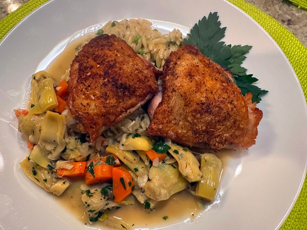 Don’t use marinated artichoke hearts for this recipe. The seasonings will overpower the other ingredients. Instead of spooning the artichoke mixture on and around the thighs, we laid the mixture in a deep platter and placed the chicken on top to prevent the crispy skin from getting soggy before serving.