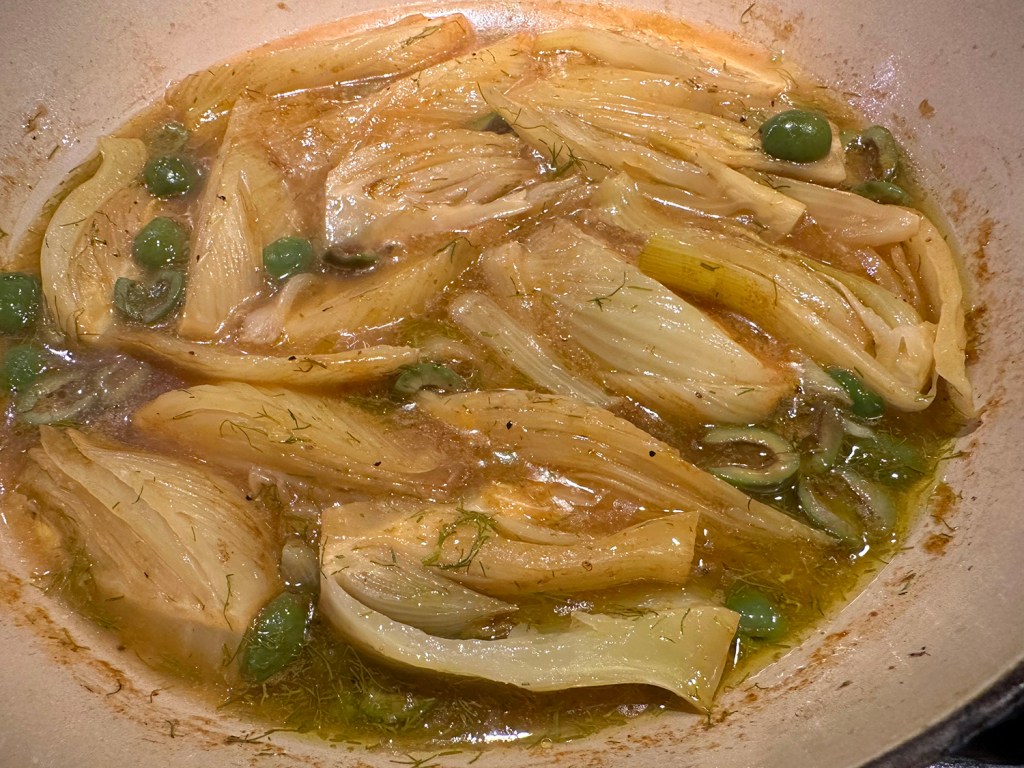4. Add wine, 1 tablespoon oil, salt, pepper, and remaining 1¾ cups water to now-empty skillet. Stir, scraping up any browned bits. Add fennel wedges, arranging them cut side down in single layer. Add olives and bring to boil over medium-high heat. Adjust heat to maintain simmer; cover; and cook until fennel is tender, 10 to 12 minutes. Flip wedges and continue to cook, uncovered, until liquid is reduced by half, 5 to 7 minutes longer.
