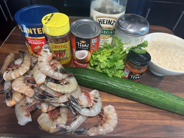 Sweet and creamy coconut rice provide a cooling contrast to shrimp sautéed with red curry paste and a piquant cucumber relish. A delicious Thai dish that’s sure to impress and please. The coconut rice and the combination of cucumber and peanuts in the salad was fabulous — a nice change from a traditional side salad.