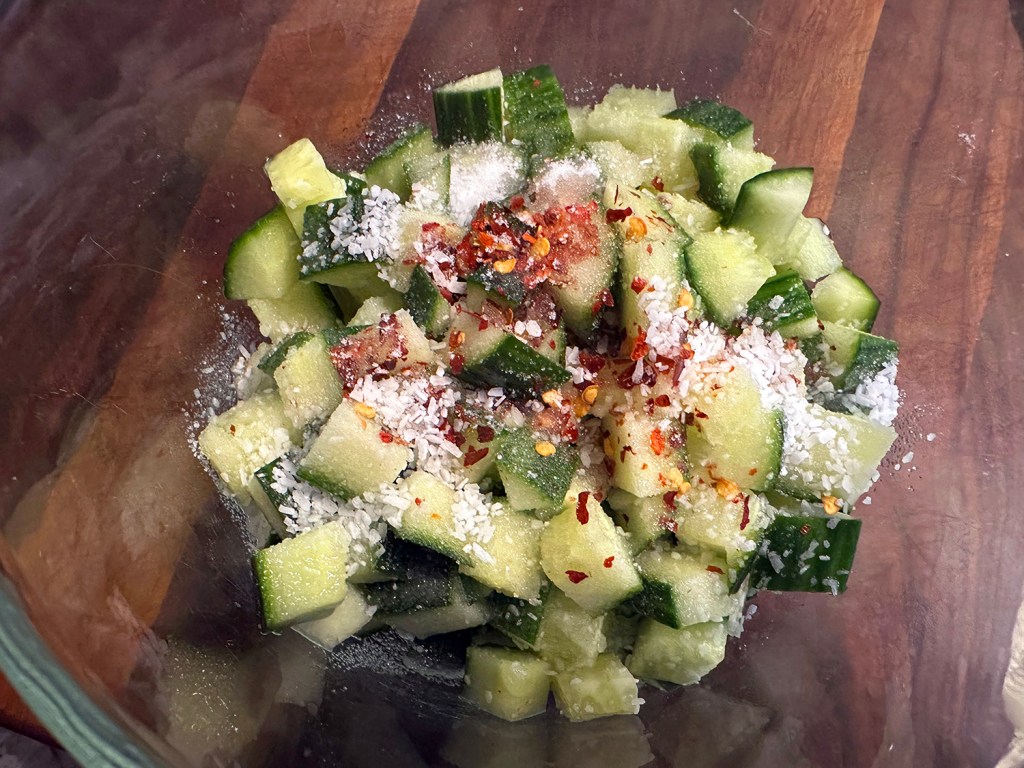 2. Meanwhile, whisk vinegar, pepper flakes, 1 tablespoon sugar, and 1 teaspoon salt in bowl until sugar is dissolved. Add cucumber, peanuts, and cilantro and toss to combine. Let stand until ready to serve, tossing occasionally.