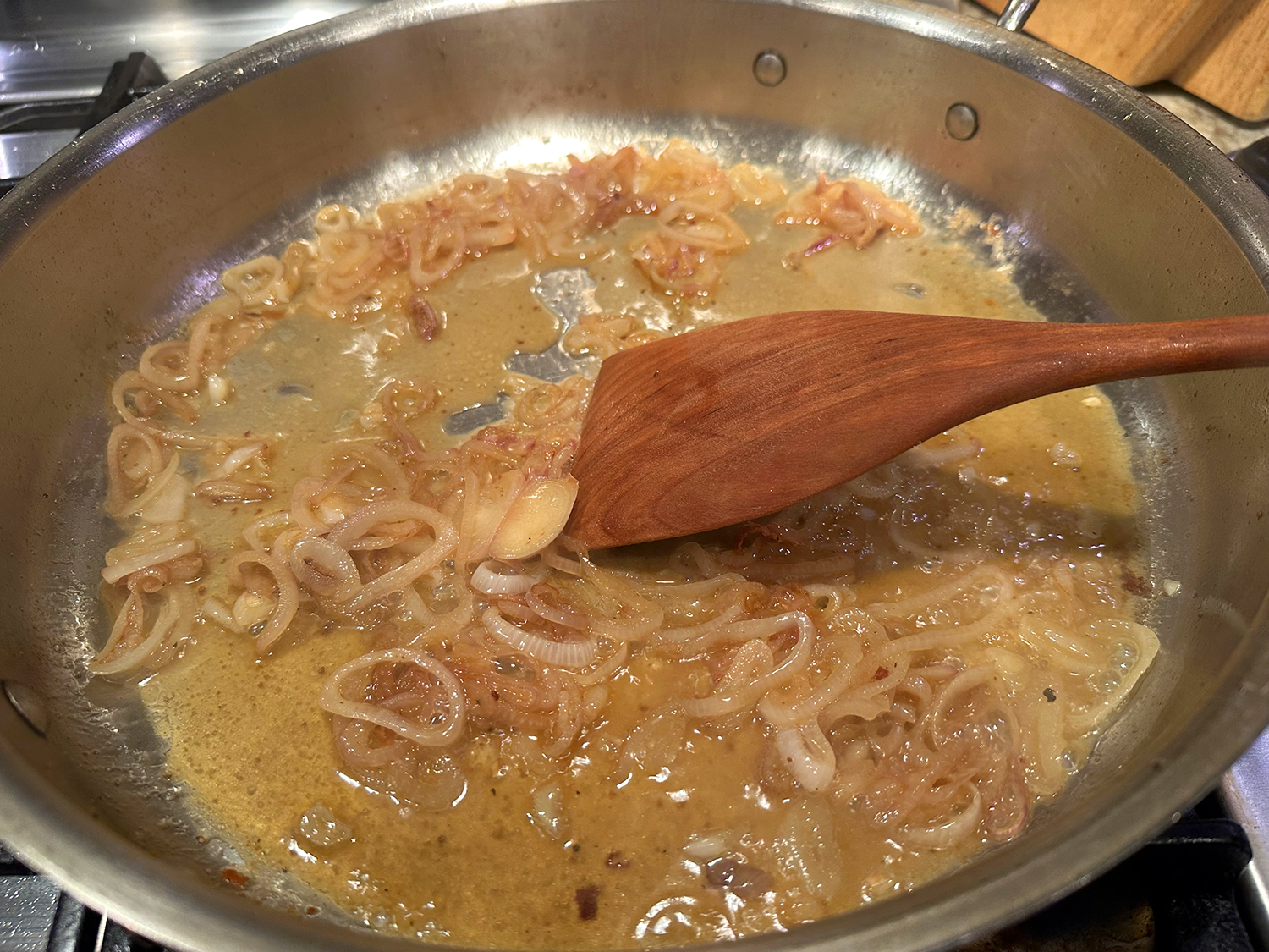 3. Remove all but about 3 tablespoons of schmaltz from the skillet and add the shallots. Decrease the heat to medium. Cook, stirring frequently, until translucent and soft, about 3 minutes.