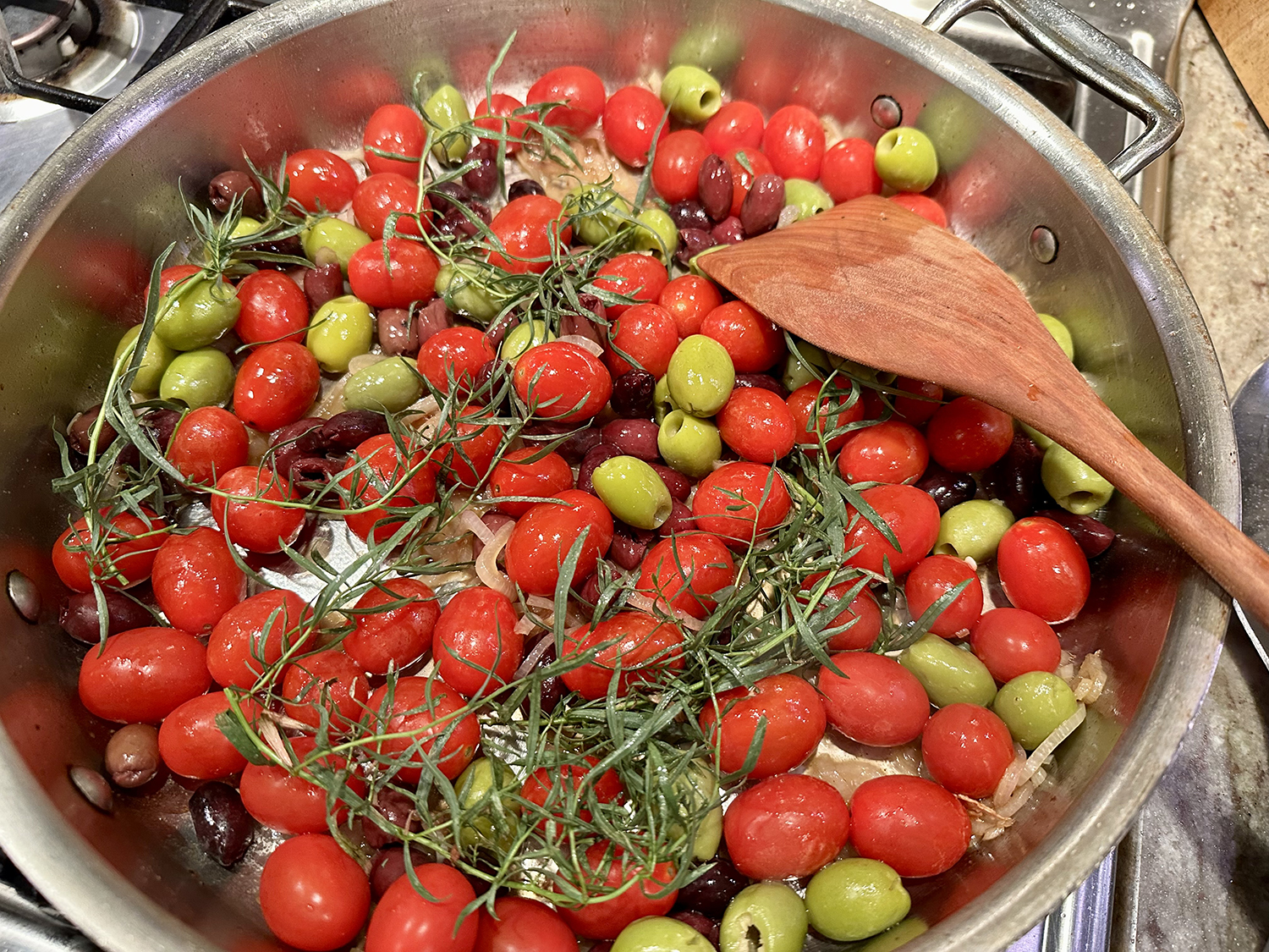 4. Add ⅓ cup of the green olive brine to the skillet and scrape to loosen the brown bits from the bottom of the pan. Add the green olives, Kalamata olives, tomatoes and tarragon. Partly cover with a lid and bring the mixture to a simmer, occasionally stirring and crushing some of the tomatoes with the back of a spoon to release their juices.