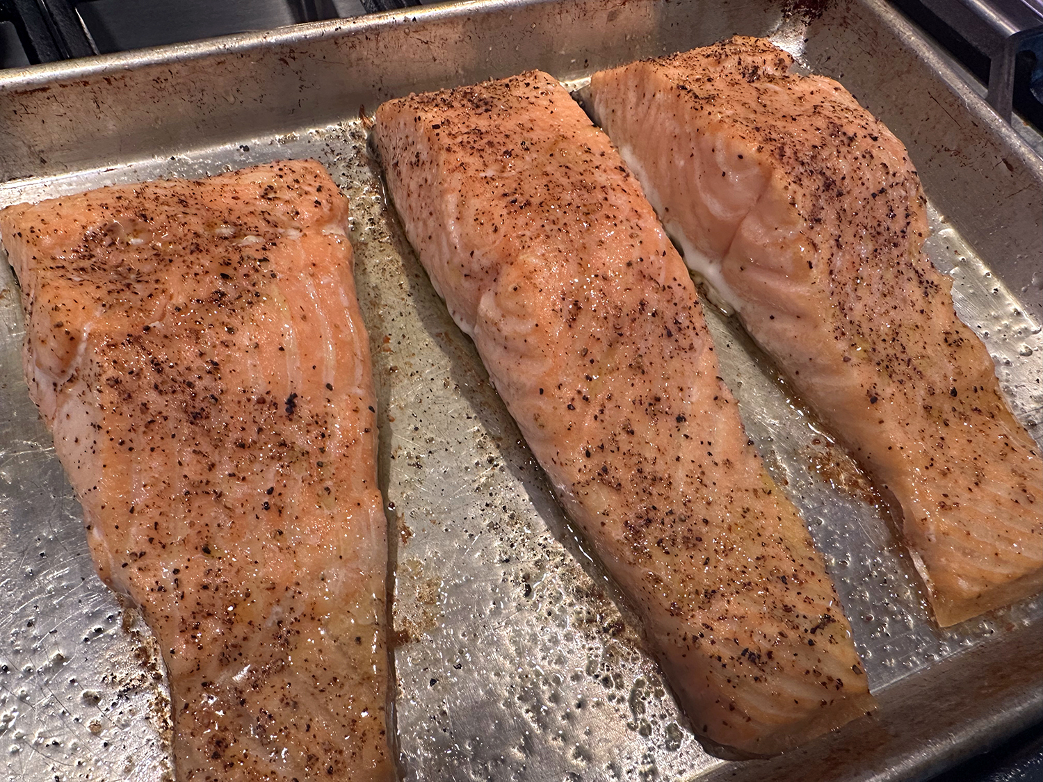 We purchased one large piece of salmon portioning it down to three 8-ounce pieces. For an even heftier meal, add some canned chickpeas, white beans or black beans (we opted not to). To finish, the vibrant tang of the bright ginger-scallion vinaigrette balances the richness of the roasted salmon.