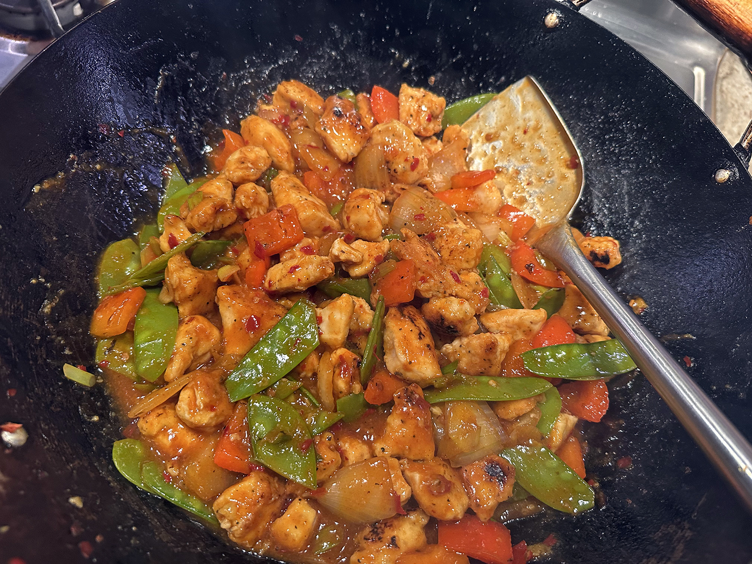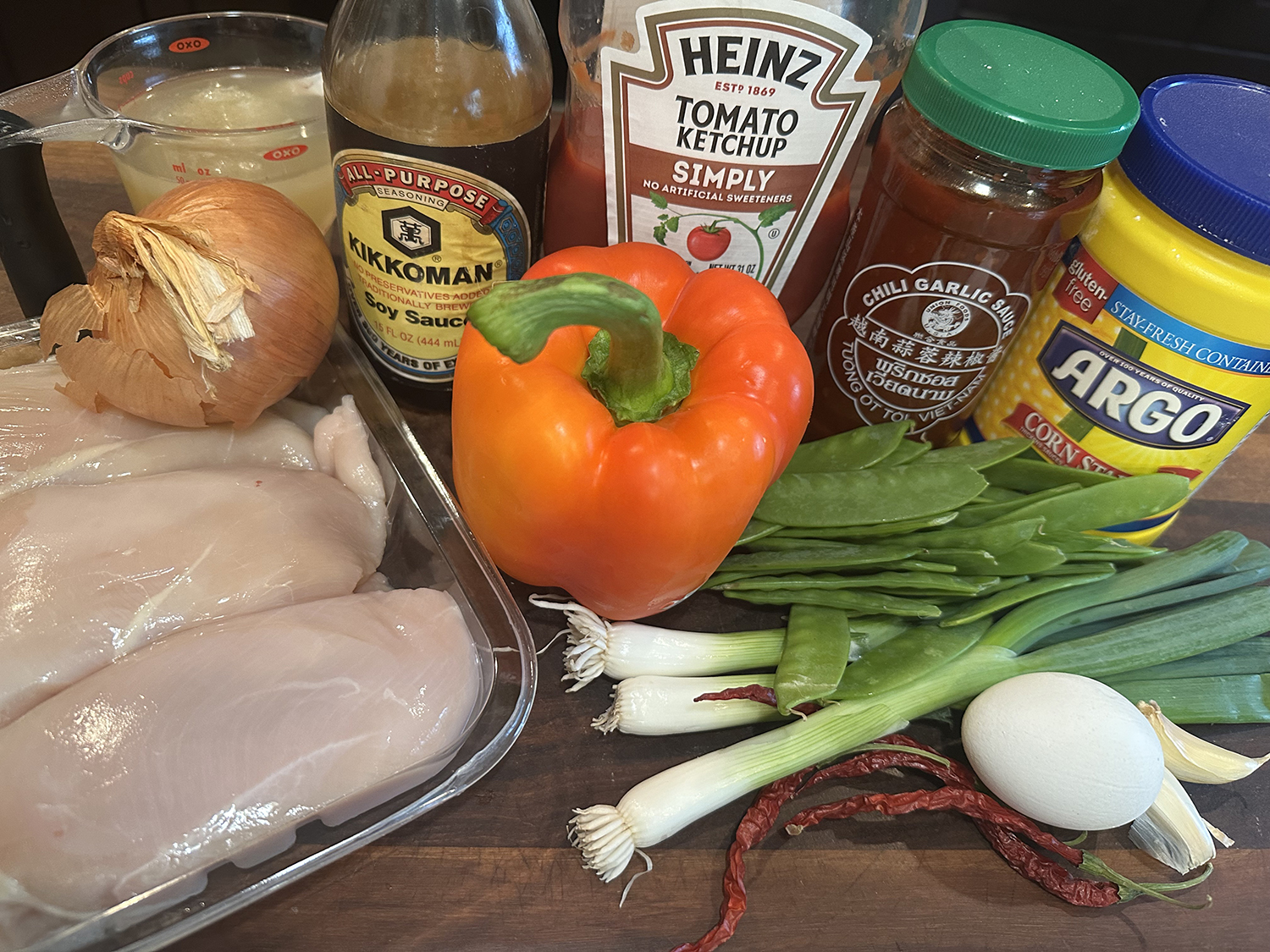 Velveting the chicken in egg and cornstarch means it’ll stay tender through the short cooking process; bell pepper, snow peas and onions add freshness and crunch to the otherwise intense flavors from ketchup and chile-garlic sauce.