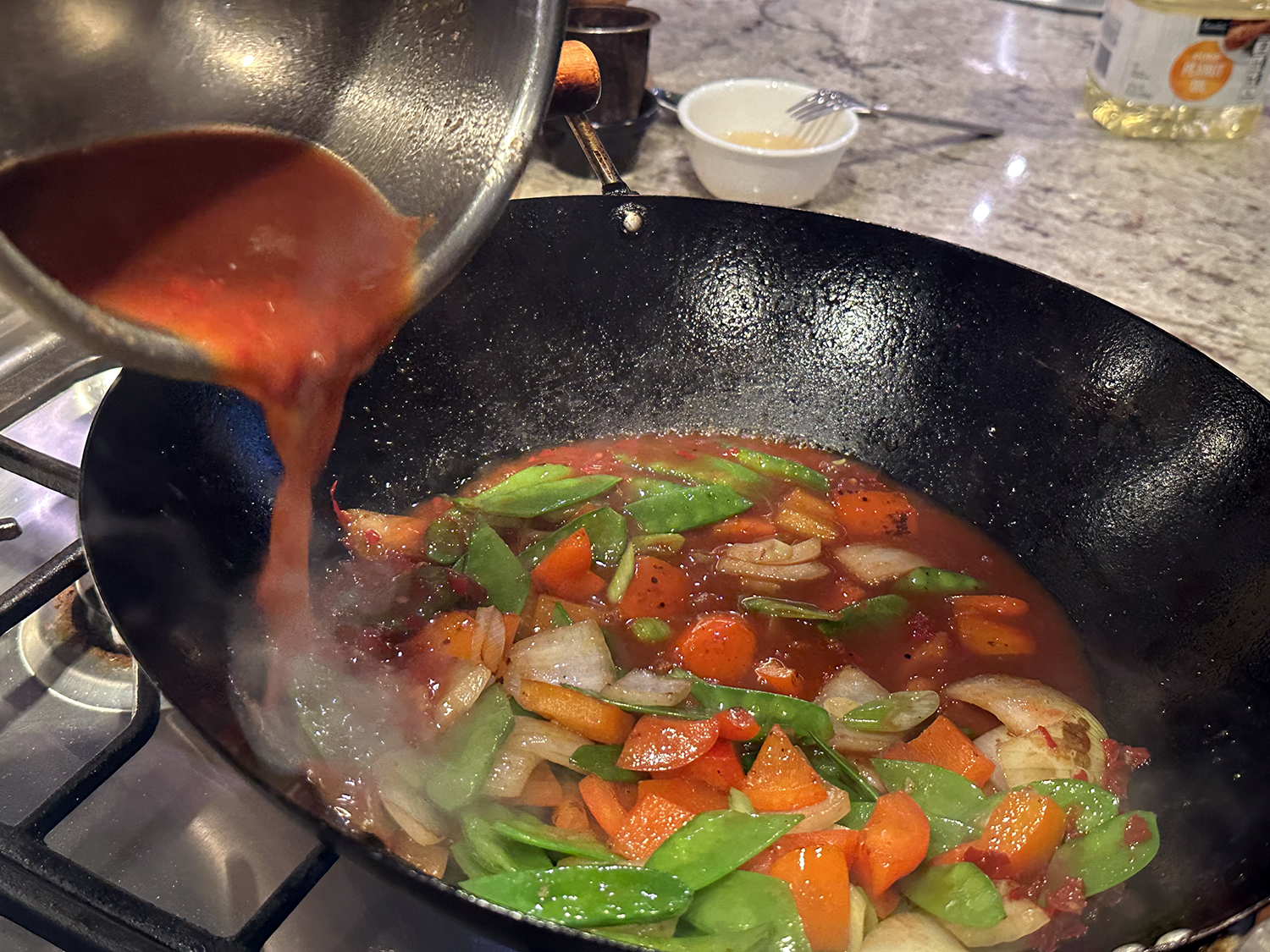 As is typical, we did make some alterations. The ketchup was cut back by half to limit the sweetness. And last minute, we nixed the dried chiles altogether since their was so much chile-garlic sauce, and it was plenty spicy. Six ounces of snow peas were included for more color and crunch.