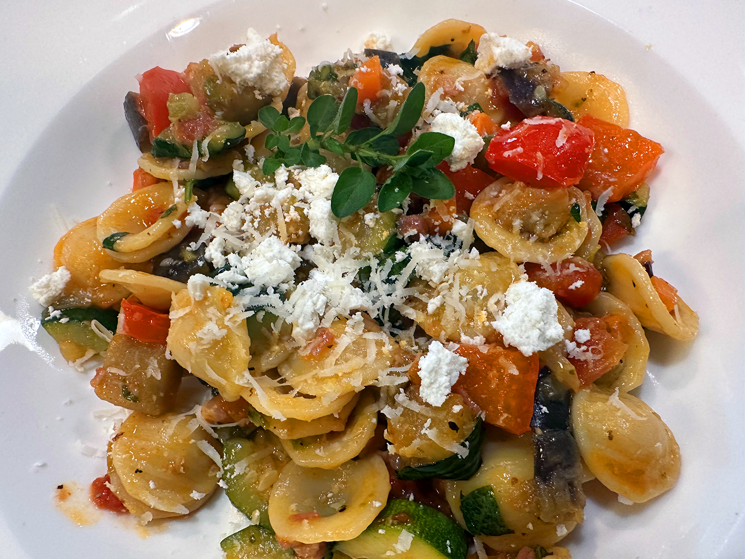 The sauce traditionally is paired with a handmade ring-shaped pasta called anellini. In its place, store-bought orecchiette is used , which does an excellent job of catching chunks of the rustic sauce.