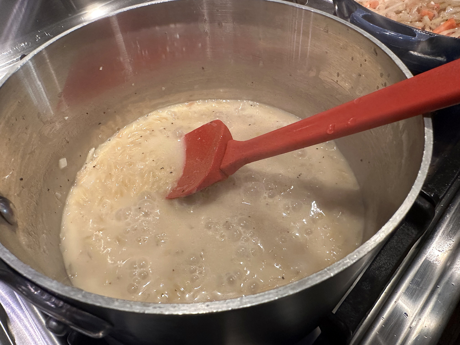 This Milk Street recipe is the delicious marriage of orzo pasta and fettuccine Alfredo. The orzo is cooked like rice, as if making risotto, so the starches create a creamy, silky sauce. Butter and Parmesan join the mix as a nod to Alfredo, and sweet peas add color and sweetness.