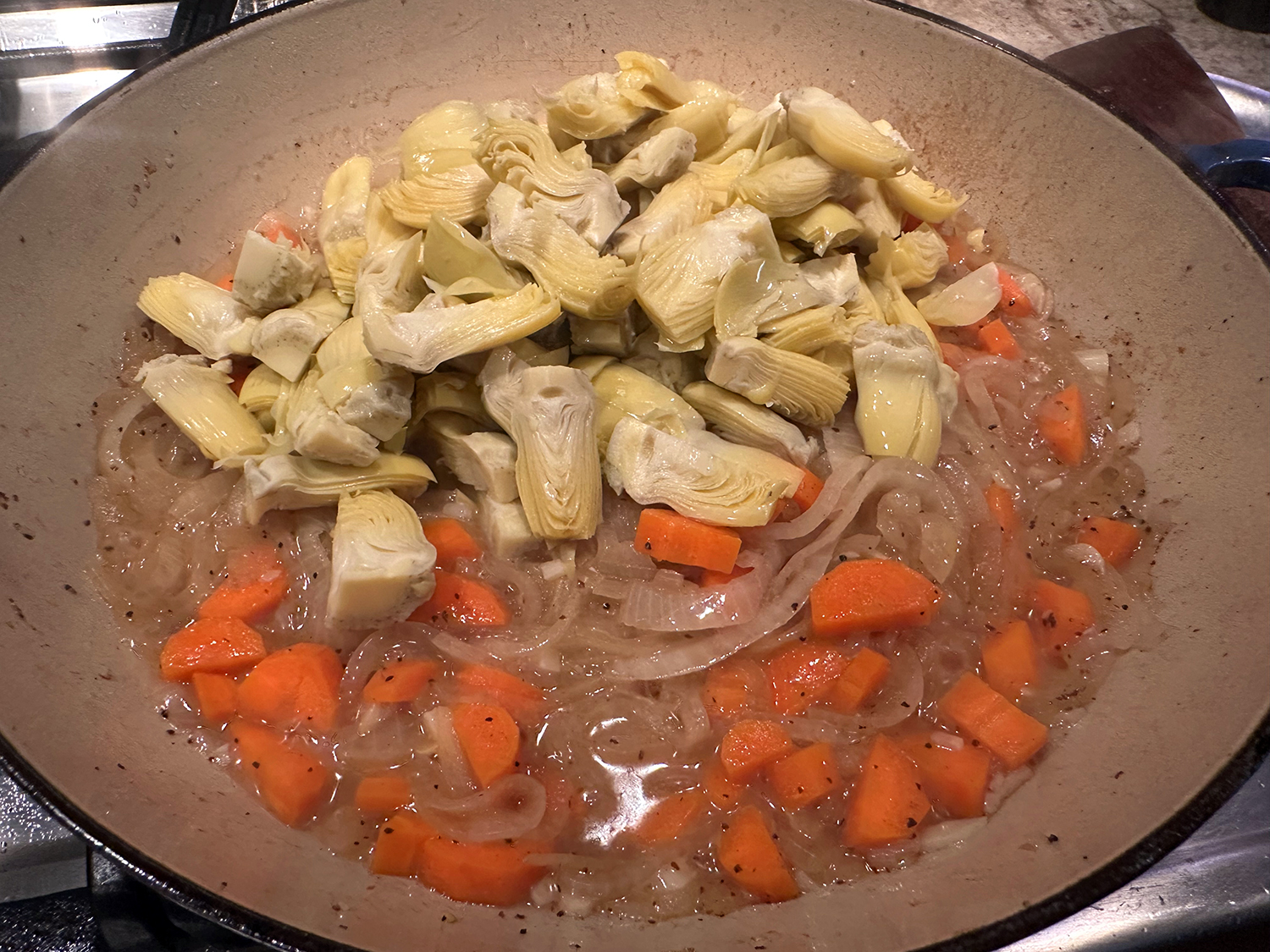 3. Stir in the artichokes, lemon zest and broth. Bring to a simmer over medium-high and cook, uncovered and stirring occasionally, until the carrots are tender and the liquid is slightly reduced, 4 to 5 minutes. Remove from the heat, cover and set aside.