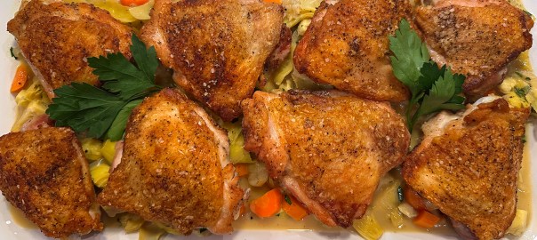 Maybe you have never of Artichauts à la barigoule, a classic Provençal braise that combines fresh artichoke hearts with aromatic vegetables, herbs and white wine. If not, this recipe is worth a try. Here, chicken thighs are seared on the stovetop and while they finish cooking in the oven, canned artichokes are used to put together a simplified barigoule that serves as both a vegetable accompaniment and a flavorful sauce.