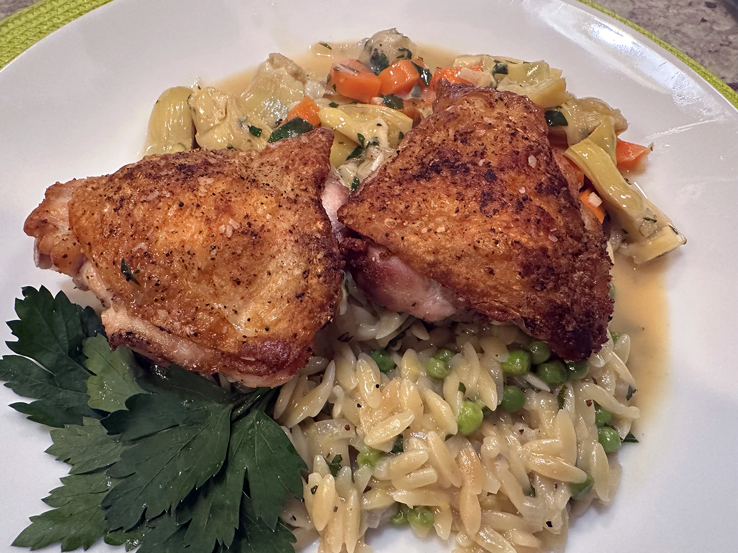 Don’t use marinated artichoke hearts for this recipe. The seasonings will overpower the other ingredients. Instead of spooning the artichoke mixture on and around the thighs, we laid the mixture in a deep platter and placed the chicken on top to prevent the crispy skin from getting soggy before serving.