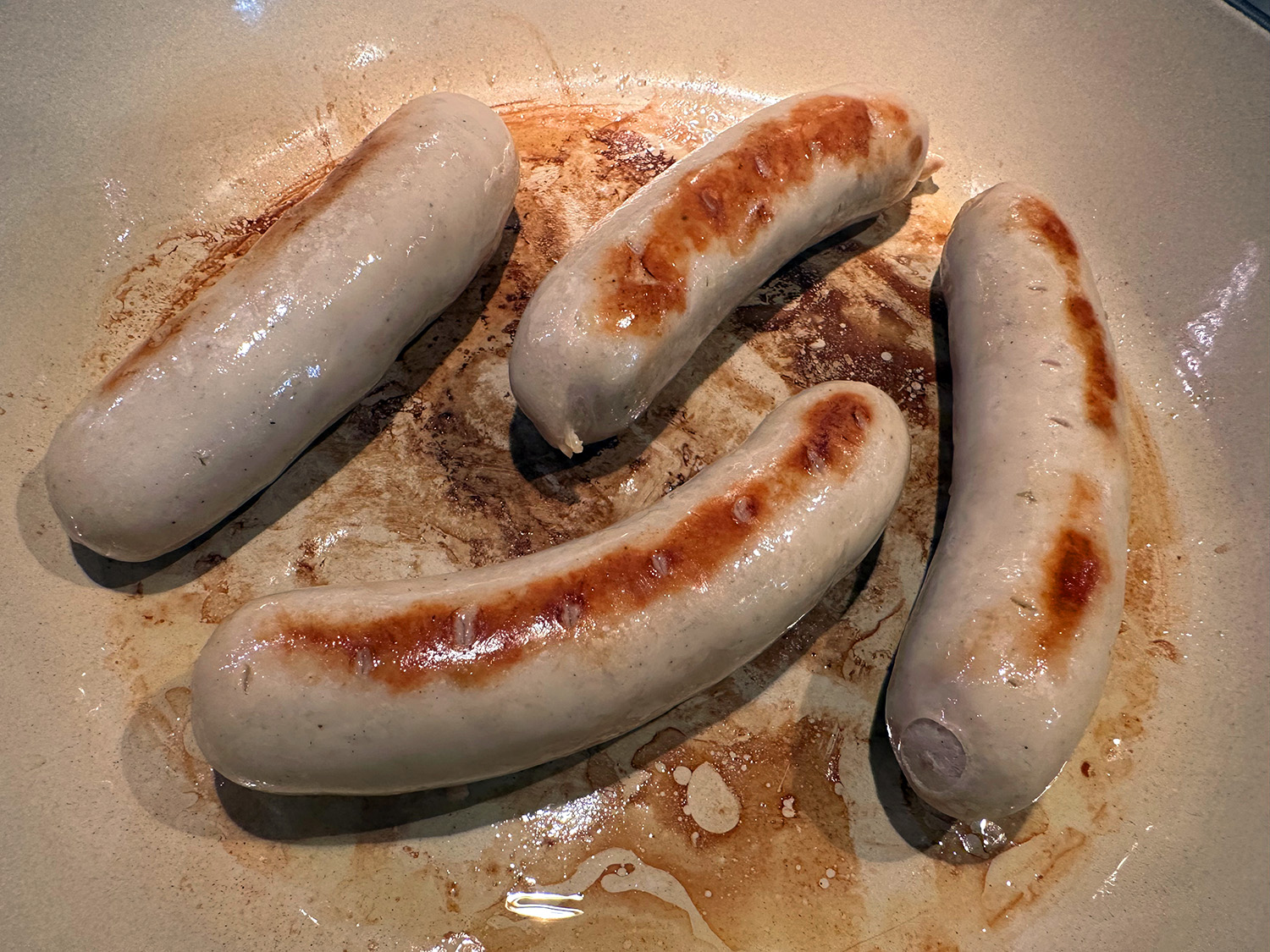 Pricking the links before too much pressure has built up inside the casings is vital, as it allows the meat to exude just enough fat and moisture to create a generous fond but not so much that the meat’s succulence is diminished.