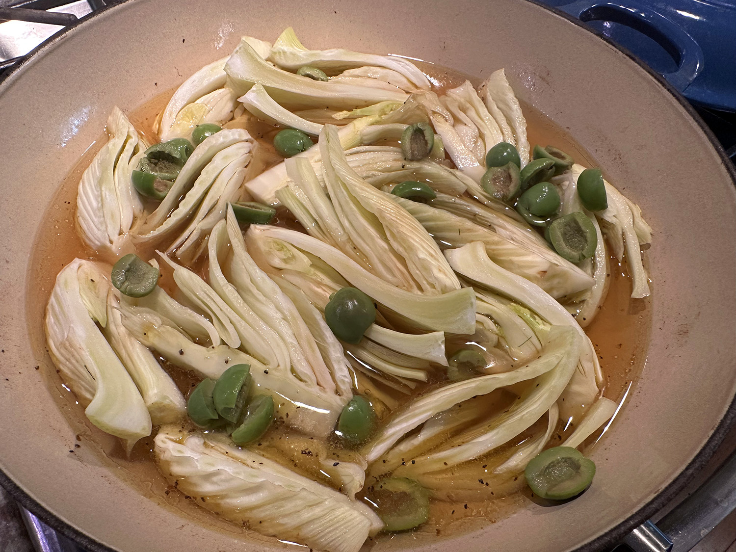 4. Add wine, 1 tablespoon oil, salt, pepper, and remaining 1¾ cups water to now-empty skillet. Stir, scraping up any browned bits. Add fennel wedges, arranging them cut side down in single layer. Add olives and bring to boil over medium-high heat. Adjust heat to maintain simmer; cover; and cook until fennel is tender, 10 to 12 minutes. Flip wedges and continue to cook, uncovered, until liquid is reduced by half, 5 to 7 minutes longer.