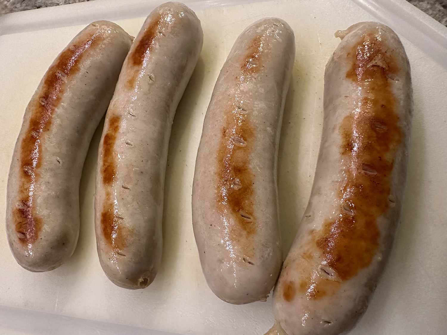 2. Bring bratwursts and ¼ cup water to simmer in 12-inch skillet over medium heat. Cover and cook until bratwursts register about 135 degrees, 5 to 7 minutes. (If skillet contents begin to sizzle, add ¼ cup water.)