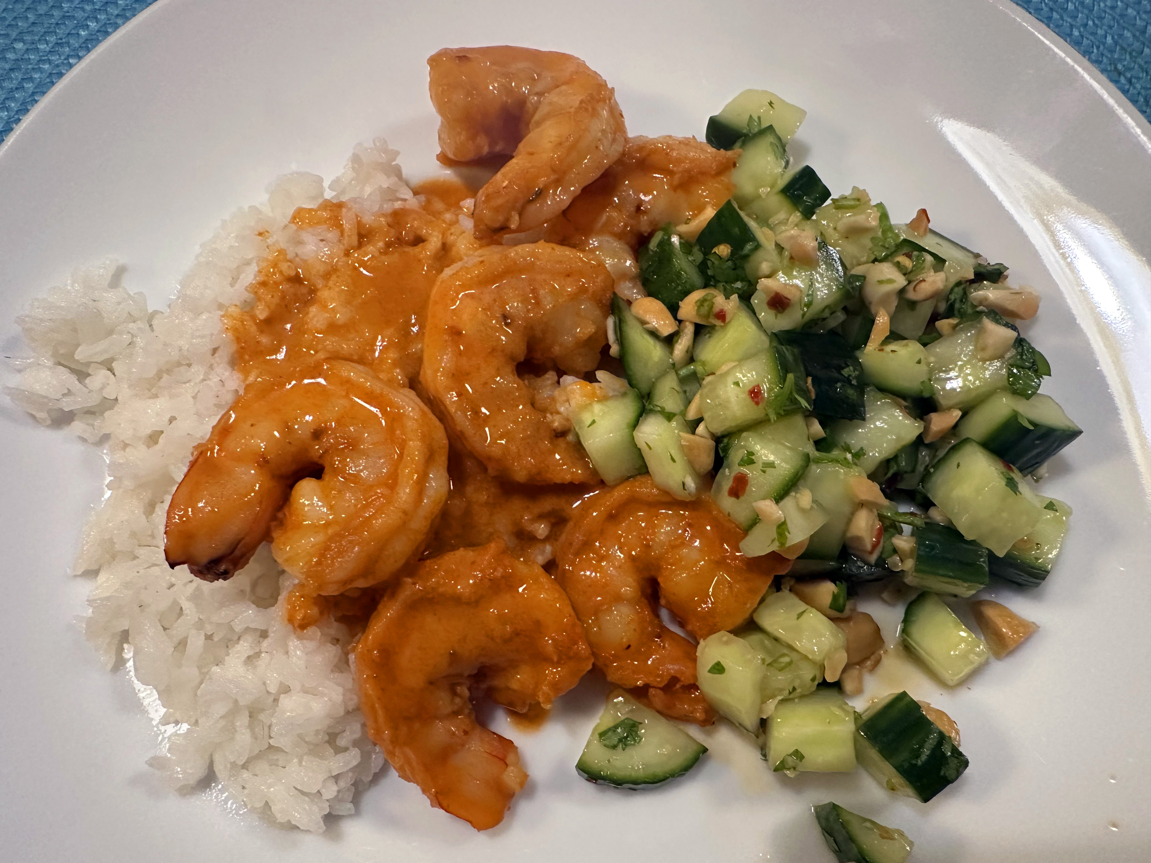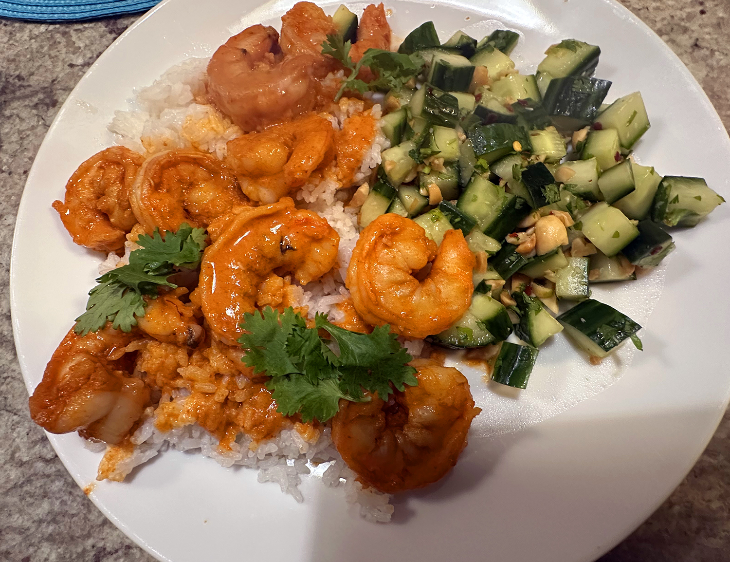 Sweet and creamy coconut rice provide a cooling contrast to shrimp sautéed with red curry paste and a piquant cucumber relish. A delicious Thai dish that’s sure to impress and please. The coconut rice and the combination of cucumber and peanuts in the salad was fabulous — a nice change from a traditional side salad.