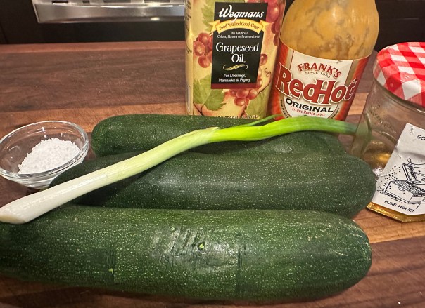 A mixture of honey and hot sauce, microwaved (or heated in a sauce pan) to a glaze consistency, adds sweetness with a bit of heat; while sliced scallions bring fresh crunch and color. If you taste the sauce by itself, it may seem too spicy. However, once it is spread on the cooked zucchini, it mellows into the perfect blend of sweet and spicy.