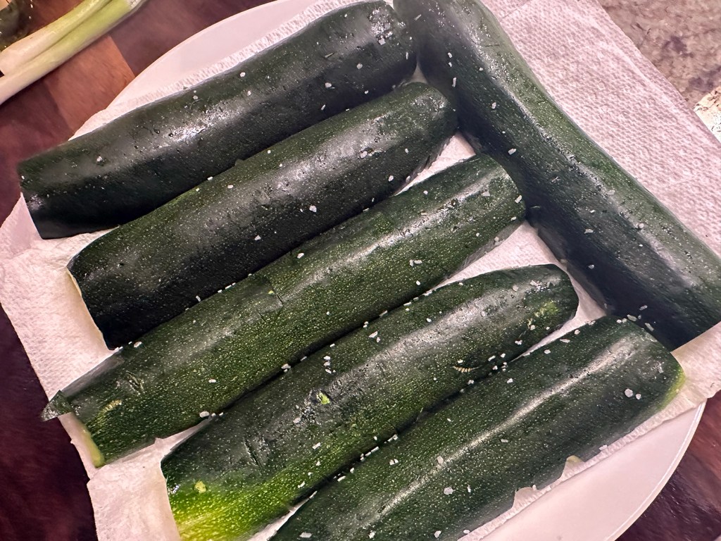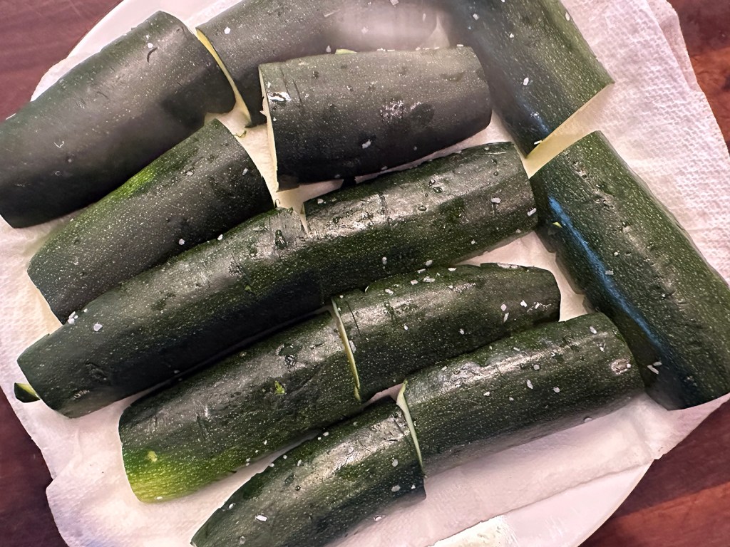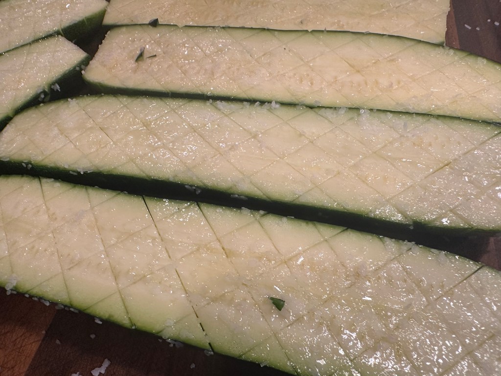 - Using sharp paring knife, score cut sides of zucchini diagonally, about ¼ inch deep, at ½-inch intervals. Turn zucchini 90 degrees and score again in opposite direction. Place scored zucchini halves close to each other, cut side up, on cutting board. Sprinkle salt evenly over halves. Rub salt into cut sides until mostly dissolved.