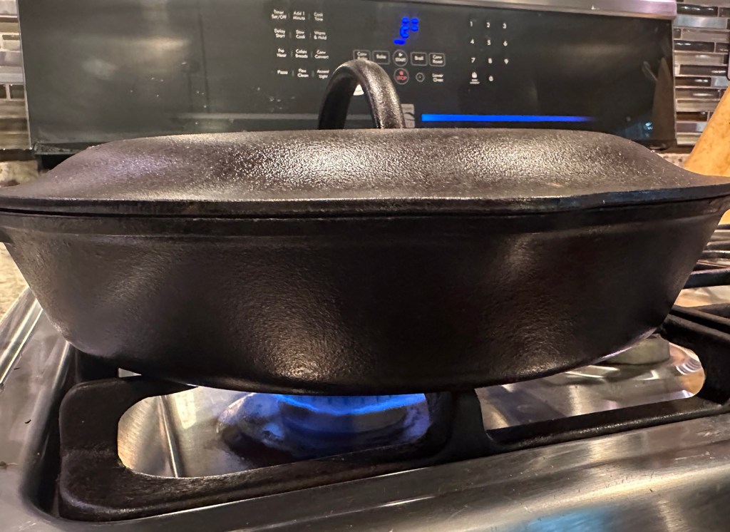Cooking in a well-oiled cast-iron skillet encourages rich browning; the metal holds the heat really well, and the fat facilitates heat transfer between the pan and the food. Covering the skillet for most of the cooking time traps moist heat that forces air out of the flesh and also dissolves its pectin, rendering the flesh fork-tender.