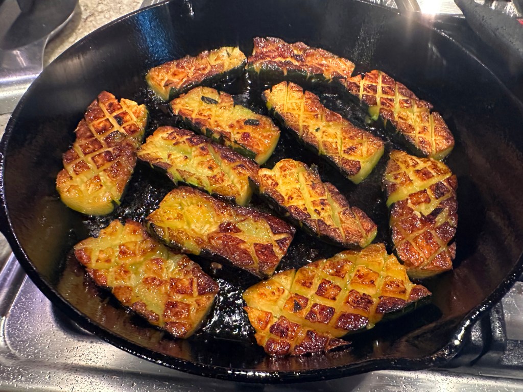 - Spread oil over surface of cold 12-inch cast-iron skillet. Arrange zucchini cut side down in skillet and press to ensure that cut sides are flush with skillet surface (reserve paper towel–lined plate). Cover skillet. Cook over medium-high heat, rotating skillet one-quarter turn every 2 minutes for even cooking, until cut sides are deeply browned, 8 to 10 minutes.