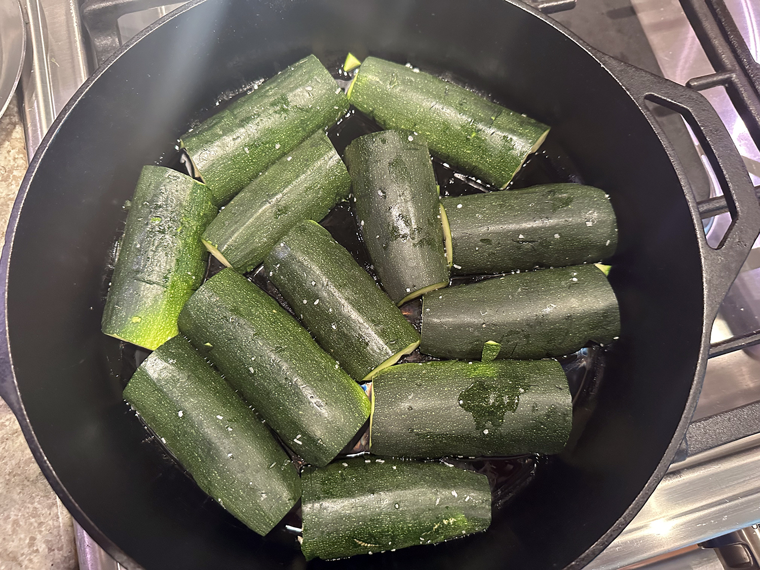 - Spread oil over surface of cold 12-inch cast-iron skillet. Arrange zucchini cut side down in skillet and press to ensure that cut sides are flush with skillet surface (reserve paper towel–lined plate). Cover skillet. Cook over medium-high heat, rotating skillet one-quarter turn every 2 minutes for even cooking, until cut sides are deeply browned, 8 to 10 minutes.