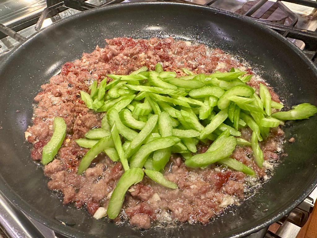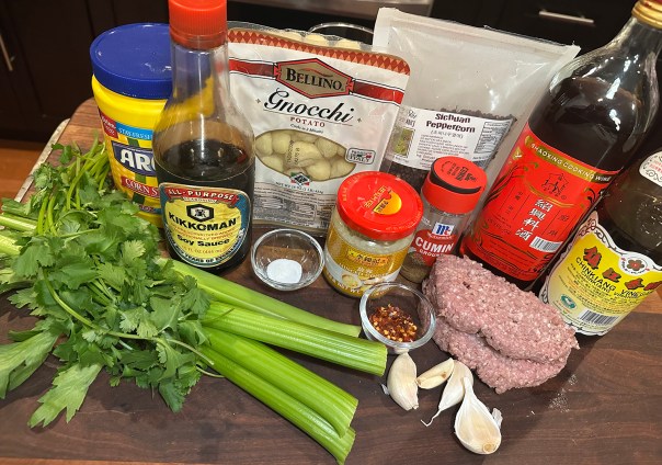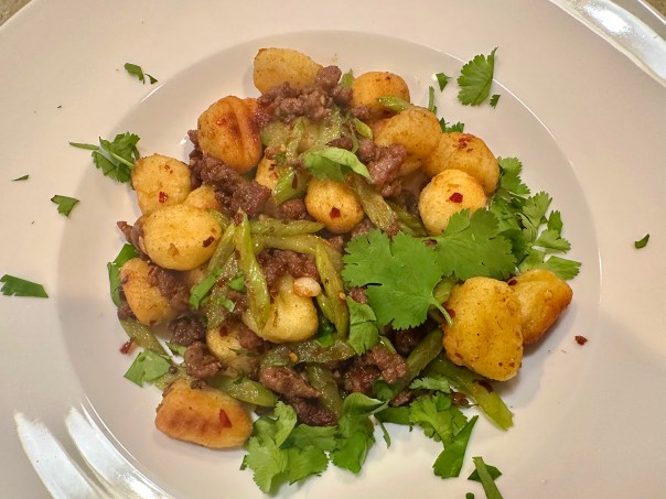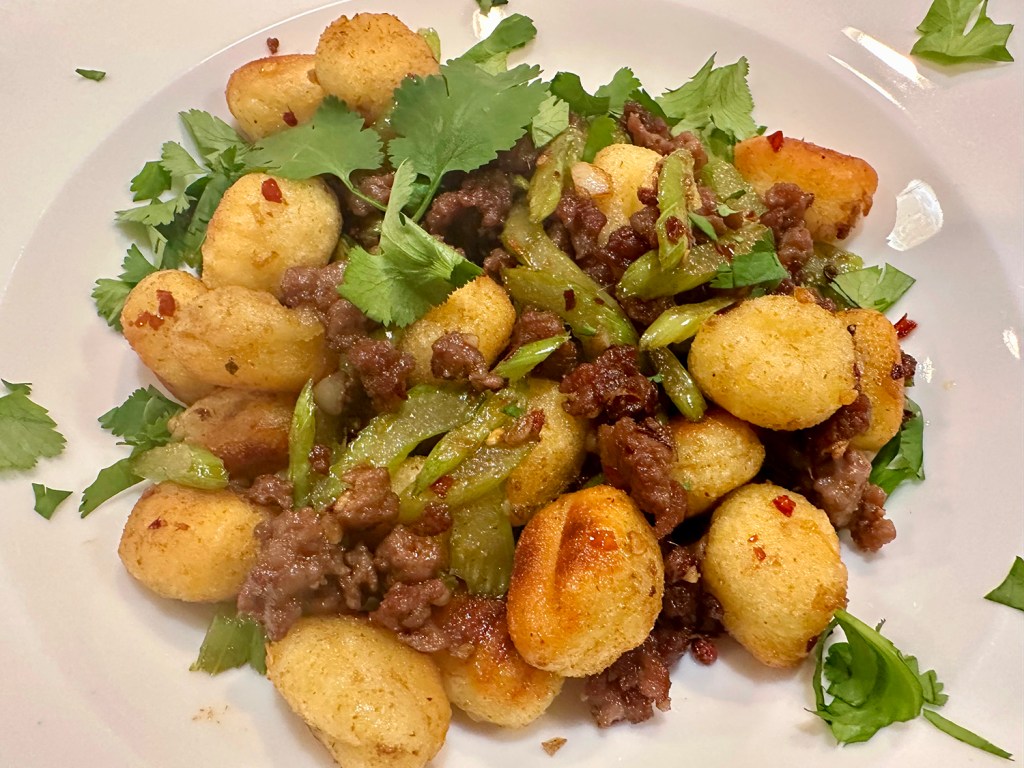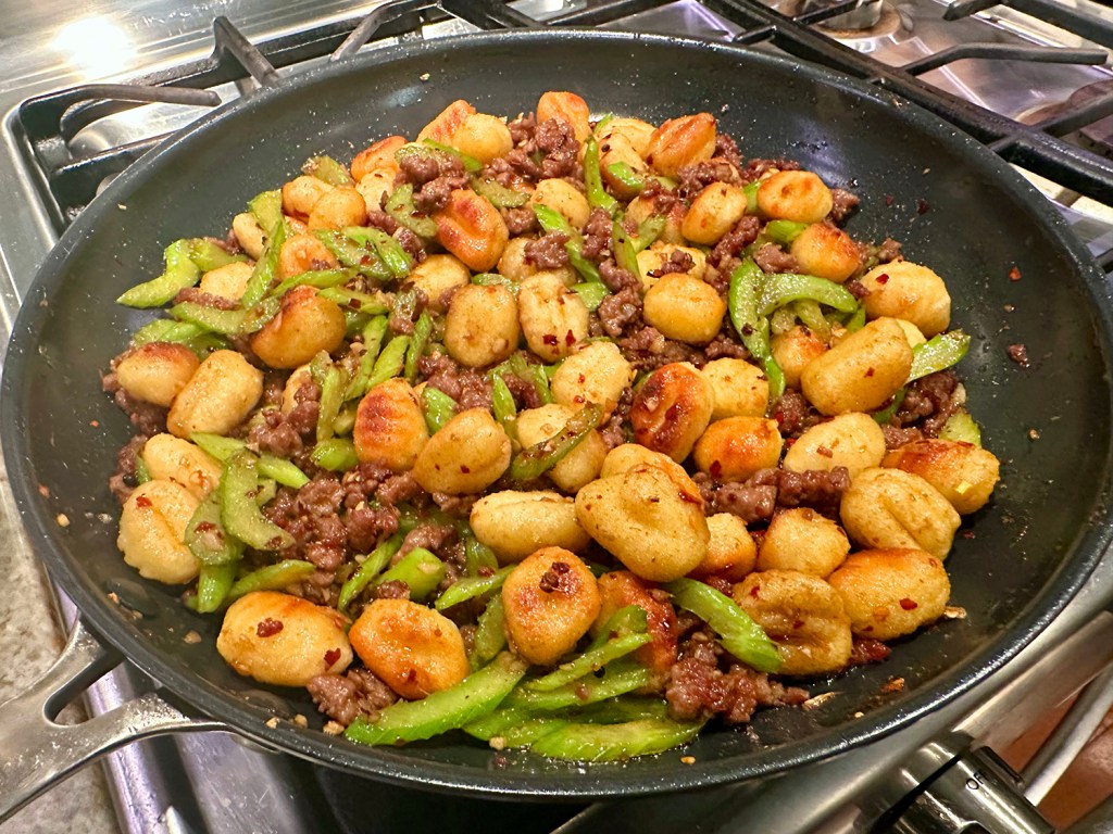 For a stir-fry-style dish, brown the ground lamb tossed with soy sauce, Shaoxing wine, and cornstarch, stirring in a robust spice blend of cumin, Sichuan chili flakes and peppercorns, as well as sugar, sliced celery for fresh crunch, and Chinese black vinegar for punch, and then add the gnocchi back to the pan.