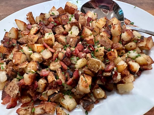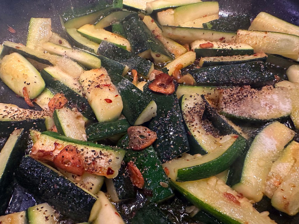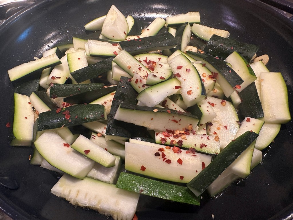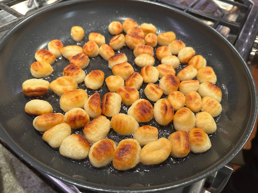 Let the gnocchi sit over medium-high heat without moving until a nicely browned crust develops, and then lightly crisp the second side so that they retained moisture and chew. Remove the gnocchi with a slotted spoon and use the remaining oil in the pan to cook other ingredients.