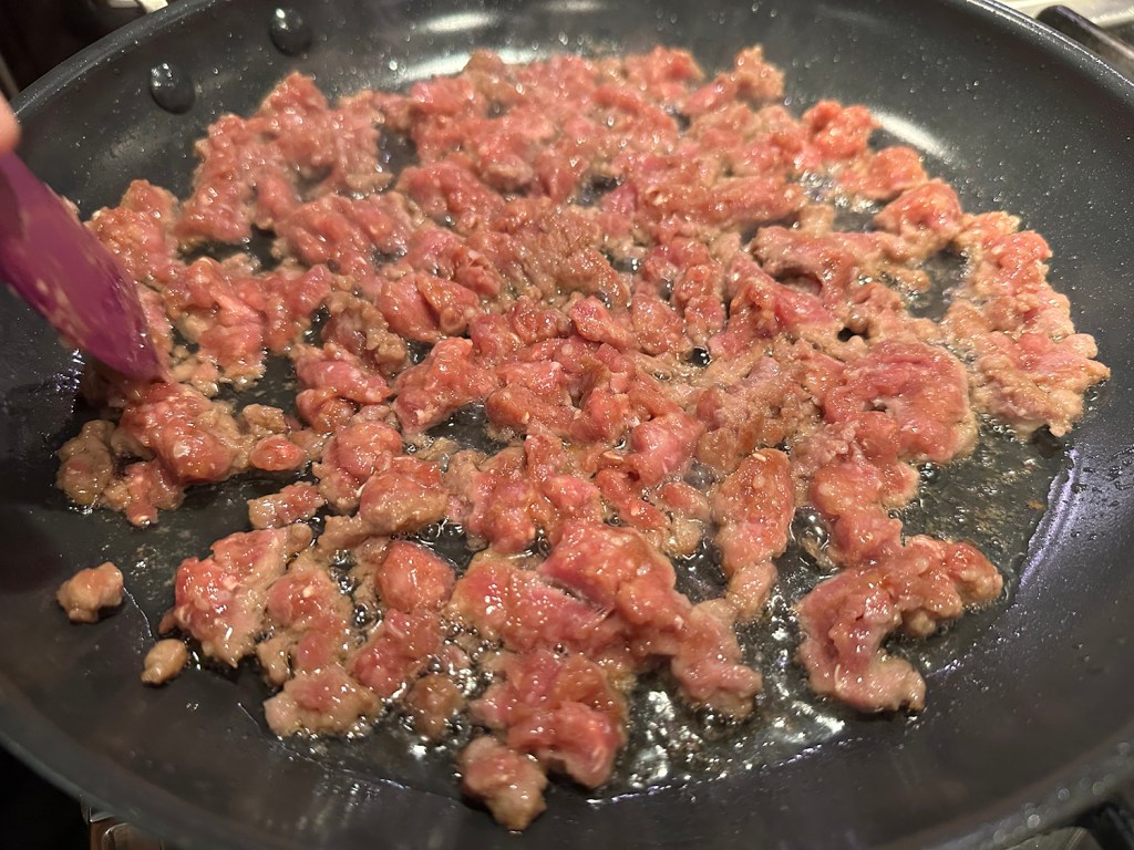 - Add lamb to skillet and cook, using wooden spoon to break meat into pieces no larger than ¼ inch, until just cooked through, 2 to 3 minutes. Add garlic and ginger and cook, stirring constantly, until fragrant, about 30 seconds.