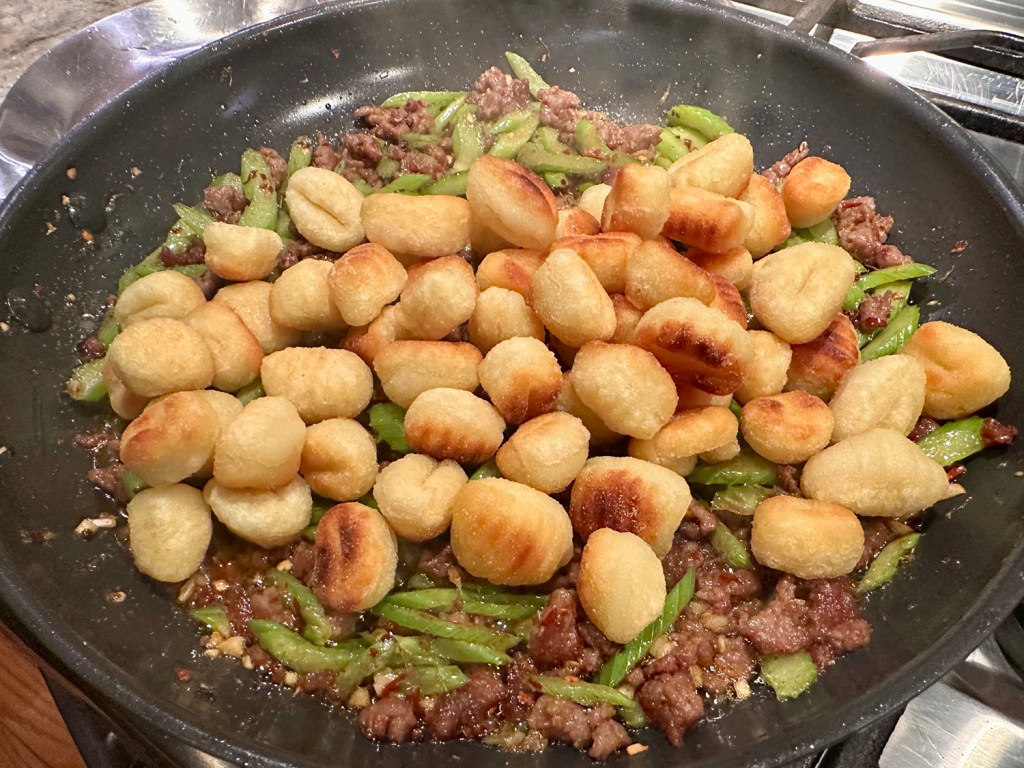 The gnocchi should be well-browned with a crisp-chewy texture. The lamb should be tender and savory with an intense, tingling heat. The celery should add refreshing crunch. As recipe testers for this, we were intrigued by the shelf-stable gnocchi, something we had never cooked with before.