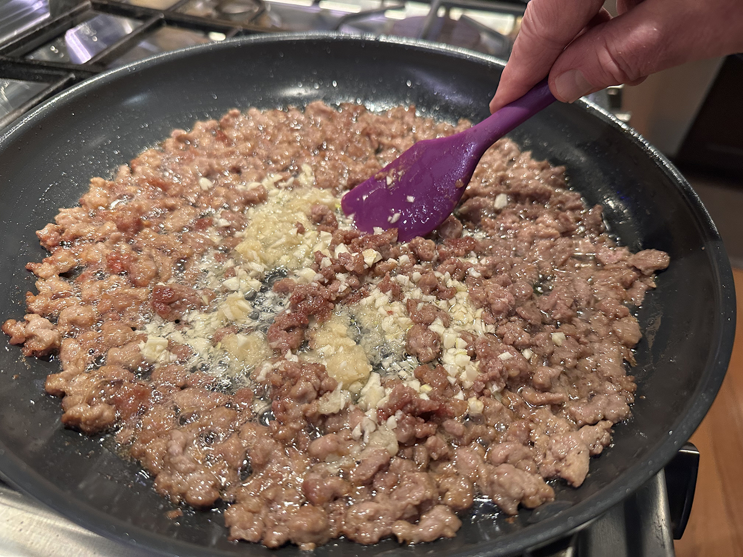 - Add lamb to skillet and cook, using wooden spoon to break meat into pieces no larger than ¼ inch, until just cooked through, 2 to 3 minutes. Add garlic and ginger and cook, stirring constantly, until fragrant, about 30 seconds.