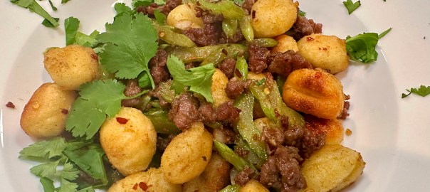For a stir-fry-style dish, brown the ground lamb tossed with soy sauce, Shaoxing wine, and cornstarch, stirring in a robust spice blend of cumin, Sichuan chili flakes and peppercorns, as well as sugar, sliced celery for fresh crunch, and Chinese black vinegar for punch, and then add the gnocchi back to the pan.