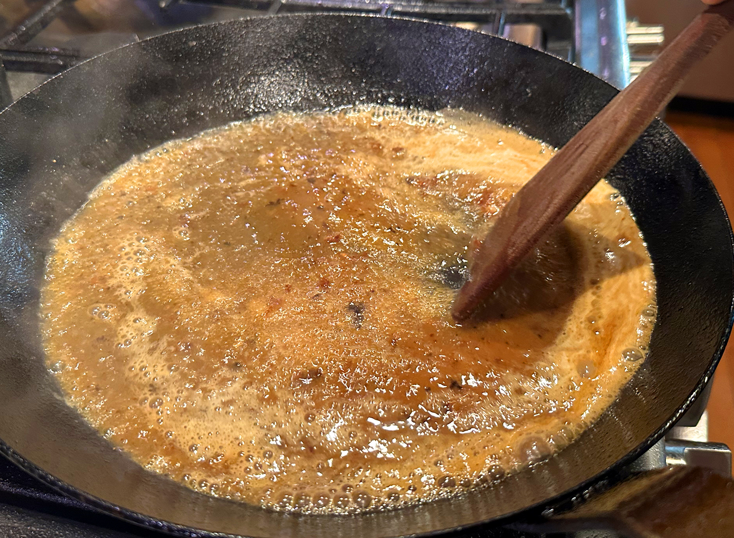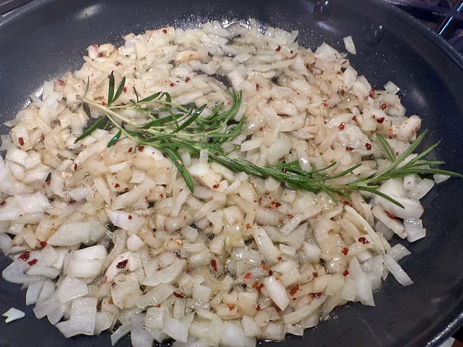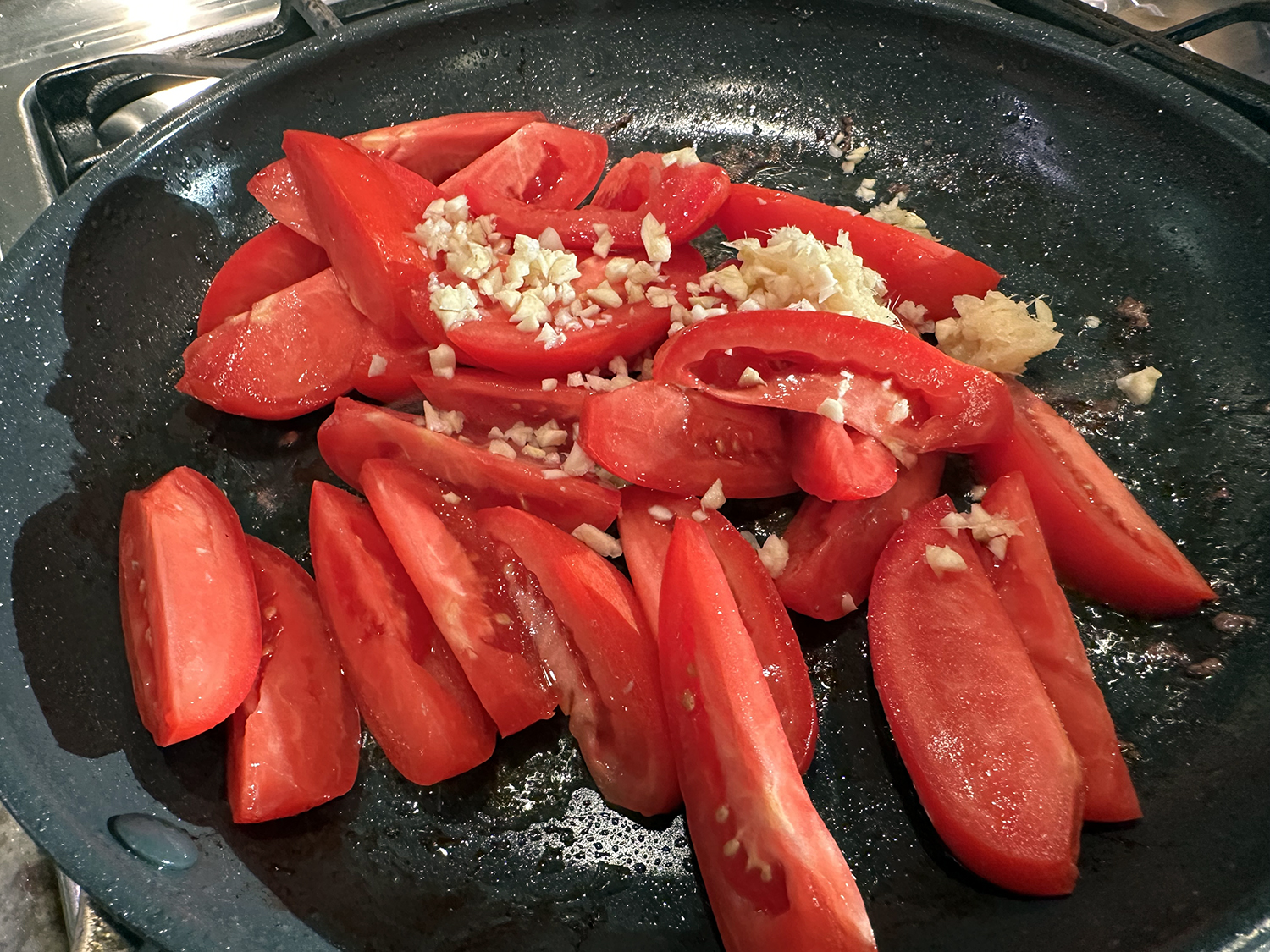 Let the gnocchi sit over medium-high heat without moving until a nicely browned crust develops, and then lightly crisp the second side so that they retained moisture and chew. Remove the gnocchi with a slotted spoon and use the remaining oil in the pan to cook other ingredients.