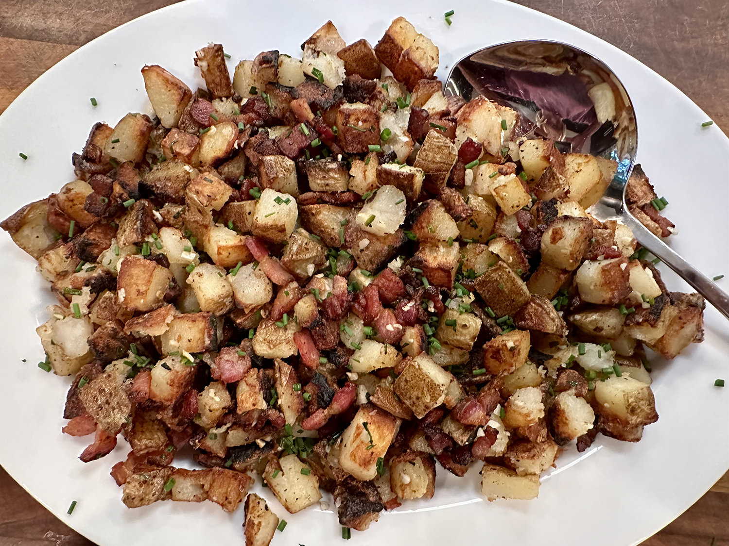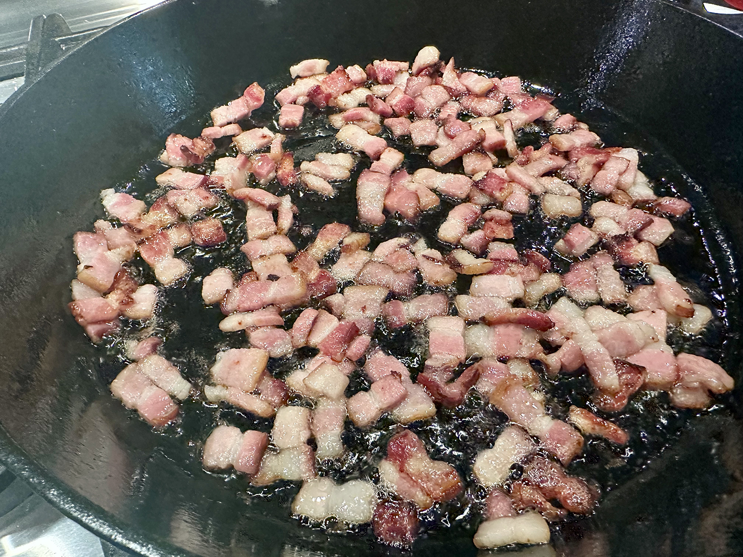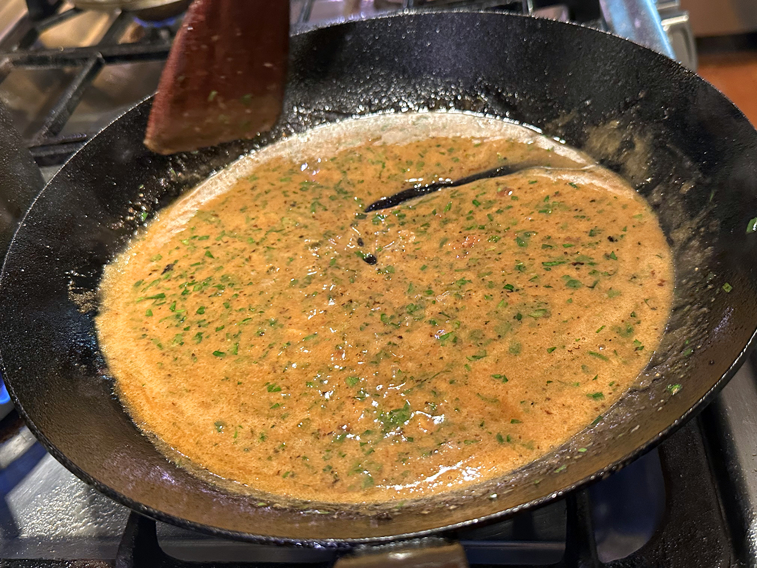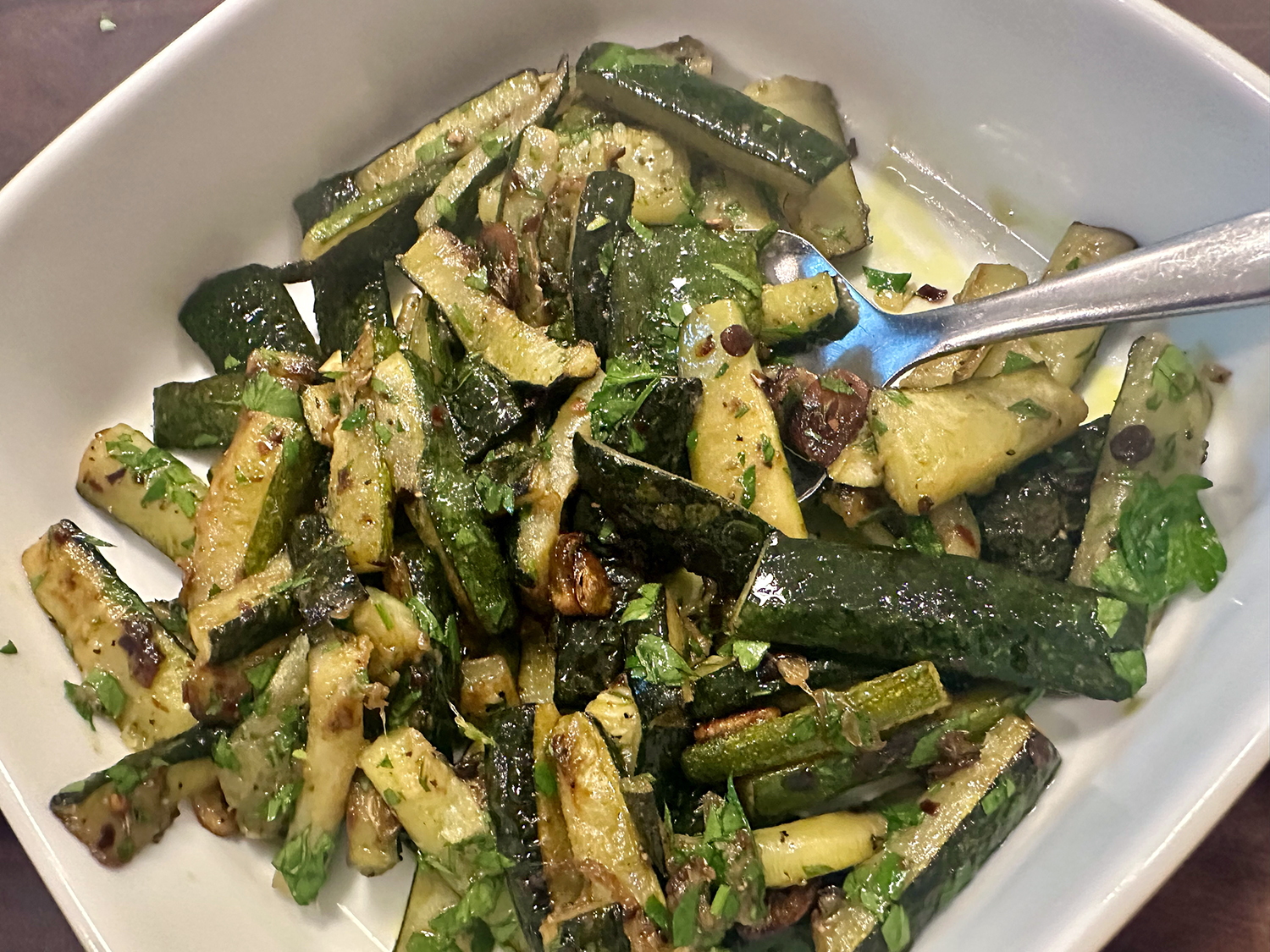 Let the gnocchi sit over medium-high heat without moving until a nicely browned crust develops, and then lightly crisp the second side so that they retained moisture and chew. Remove the gnocchi with a slotted spoon and use the remaining oil in the pan to cook other ingredients.
