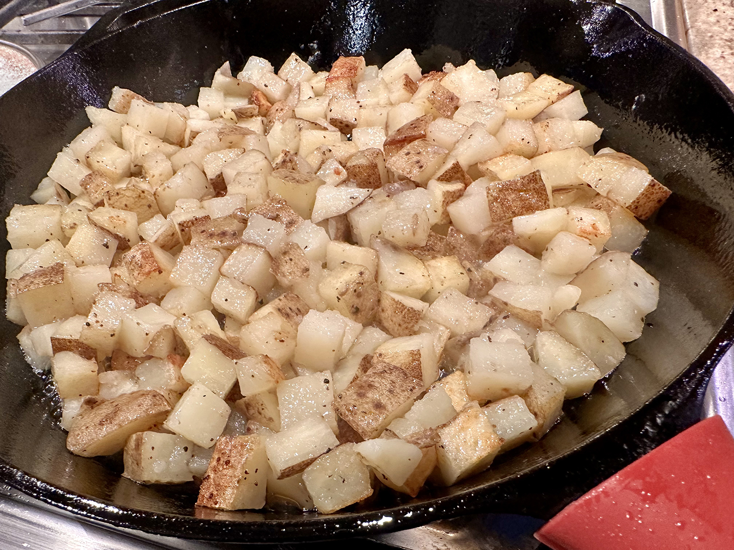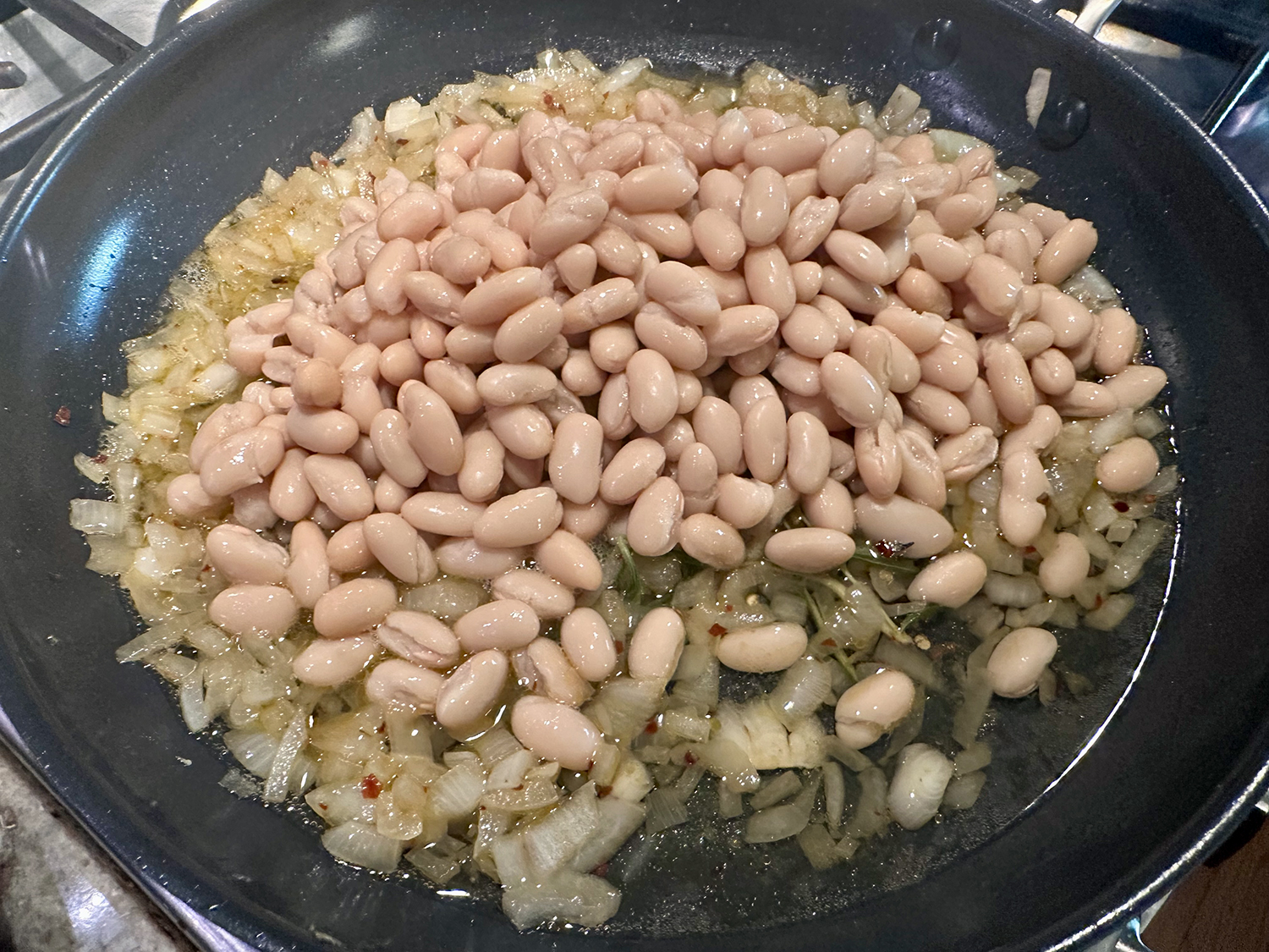 Shelf-stable gnocchi show their star potential when you skip boiling and brown them instead. For deep, even browning, arrange them in a single layer in a cold, dry skillet (easier than adding them to a pan of hot, spattering oil) and then pour a full 6 tablespoons of oil over the top, which seeps to the bottom of the skillet, thoroughly coating it and ensuring even contact with the heat.