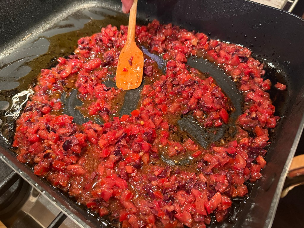 - Heat oil in a medium saucepan over medium. Add shallots; cook, stirring often, until translucent, about 3 minutes. Add tomatoes, peppers, vinegar, sugar, and salt. Cook, stirring often, until tomatoes break up, liquid evaporates, and mixture becomes a deep red paste, 25 to 30 minutes.