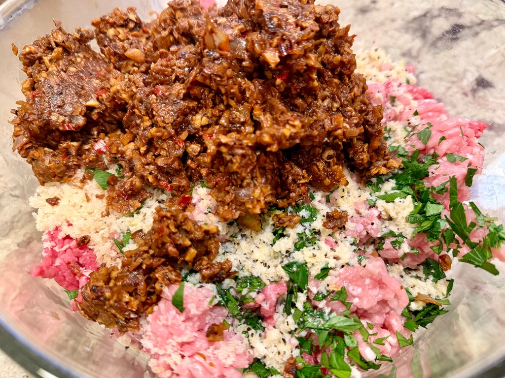 - Add parsley, breadcrumb mixture, and mushroom mixture to beef in large bowl. Using your hands or a rubber spatula, work ingredients into beef until combined. Pack beef mixture into an 8 1/2- x 4 1/2-inch loaf pan. Spread reserved 1/2 cup tomato mixture over top of meatloaf.