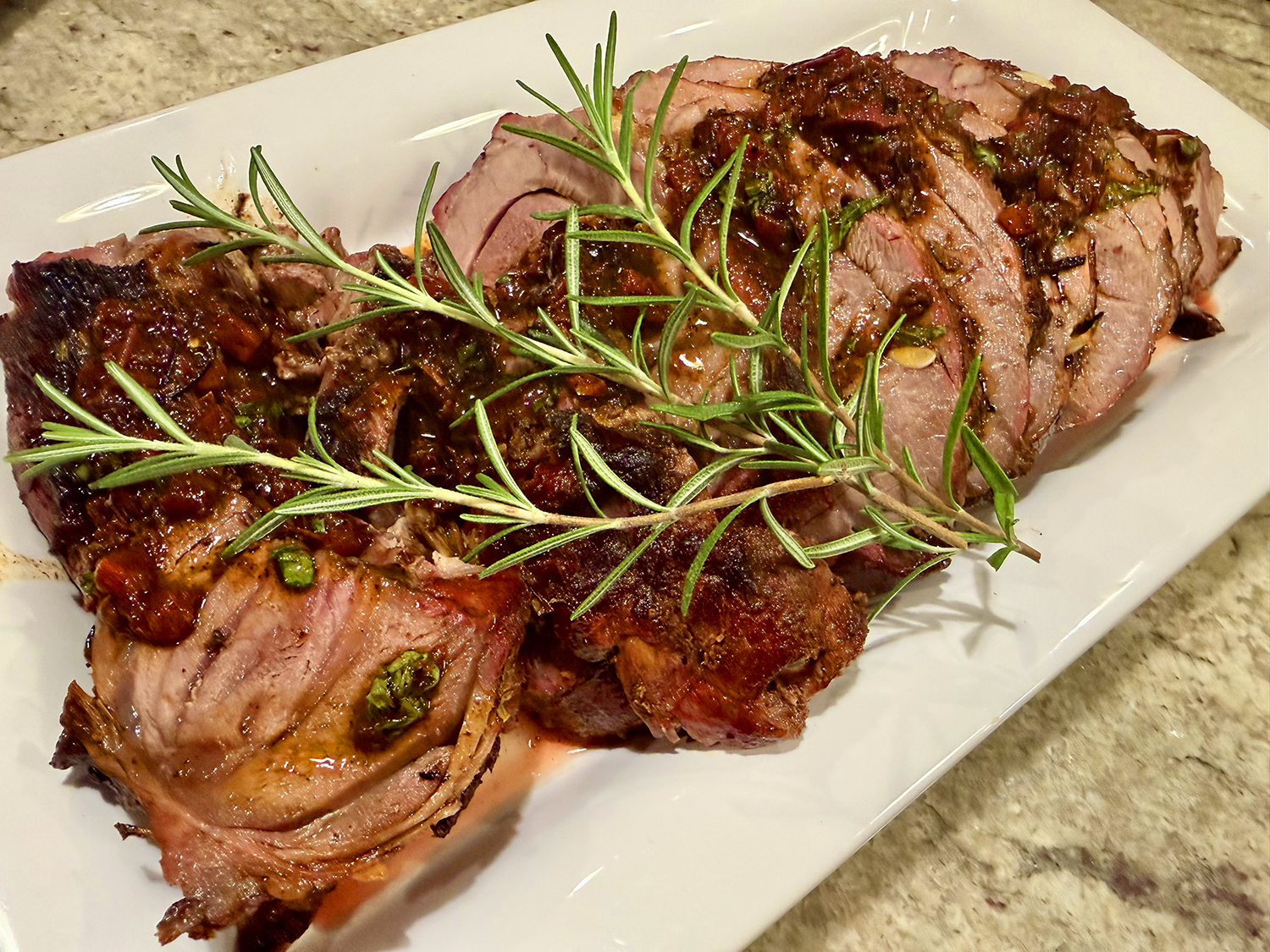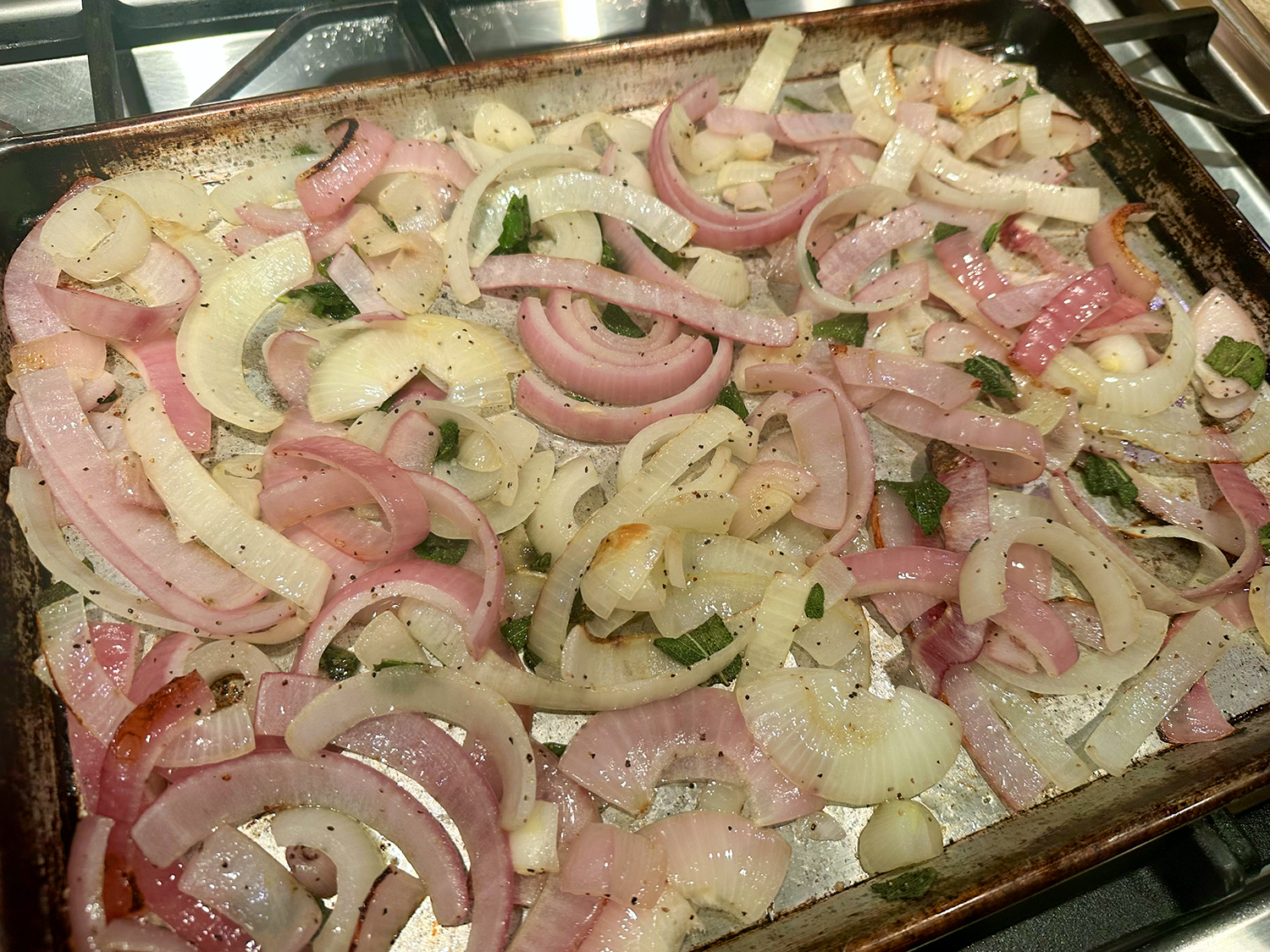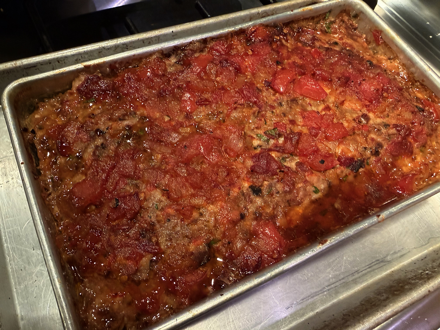 The recipe was adjusted so that more of the tomato-red pepper sauce was added on top of the loaf before baking. You will need to reheat the remaining sauce in a microwave before serving. And a word to the wise, you will be using a LOT of kitchen equipment, just sayin’…
