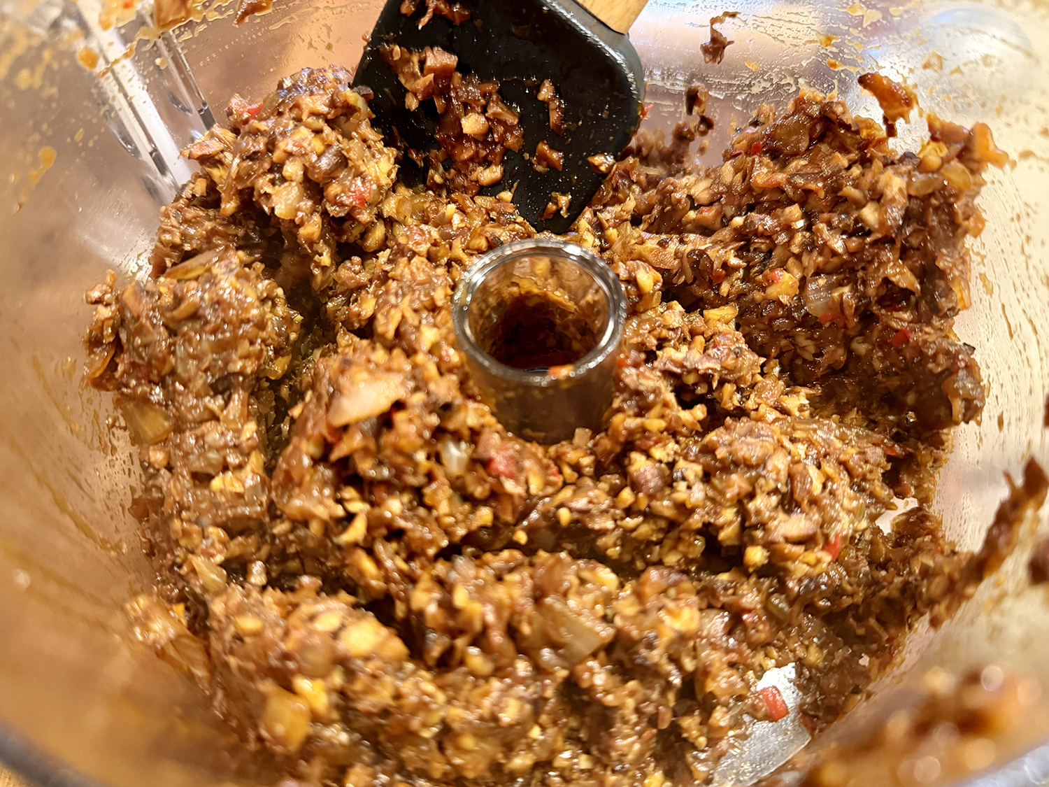 - Preheat oven to 350°F. Heat a large nonstick skillet over medium. Add oil and onion; cook, stirring occasionally, until softened, about 3 minutes. Add mushrooms and chile; cook, stirring often, until mushrooms are tender and golden brown, 15 to 20 minutes. Stir in Worcestershire sauce, shoyu, miso, and remaining 1 teaspoon salt until well combined. Transfer mixture to a food processor; pulse until finely chopped (not pureed), 8 to 10 pulses.