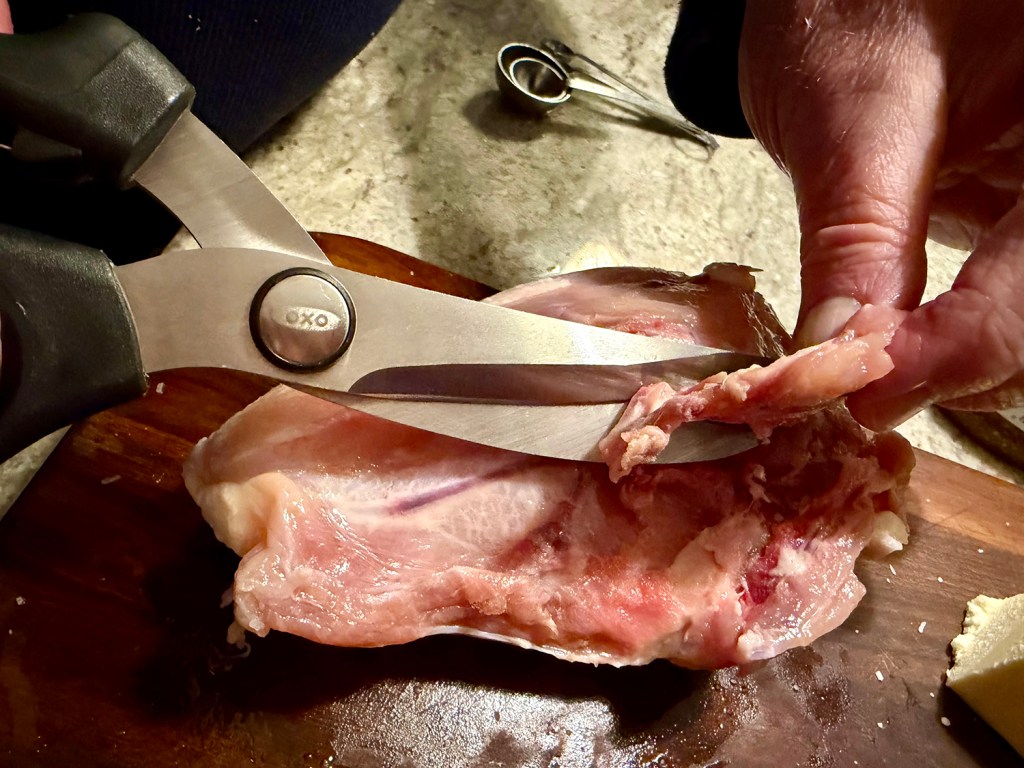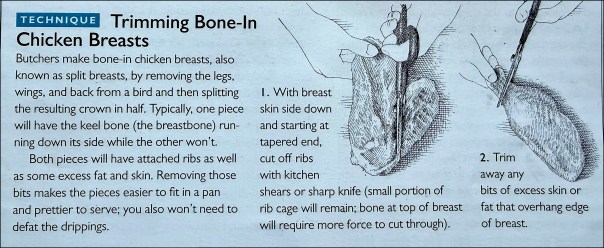 For the best results, buy chicken breasts of similar size. Use kitchen shears to snip off the ribs and trim the excess fatty skin from the thick ends of the breasts. (See illustration box below.)