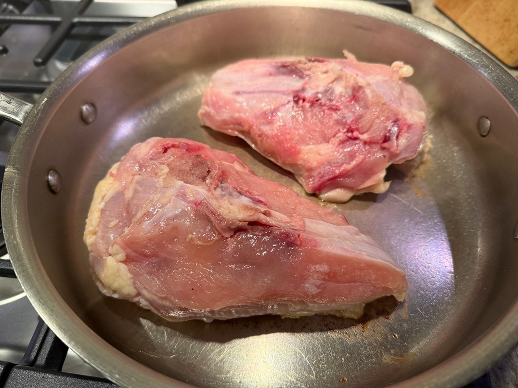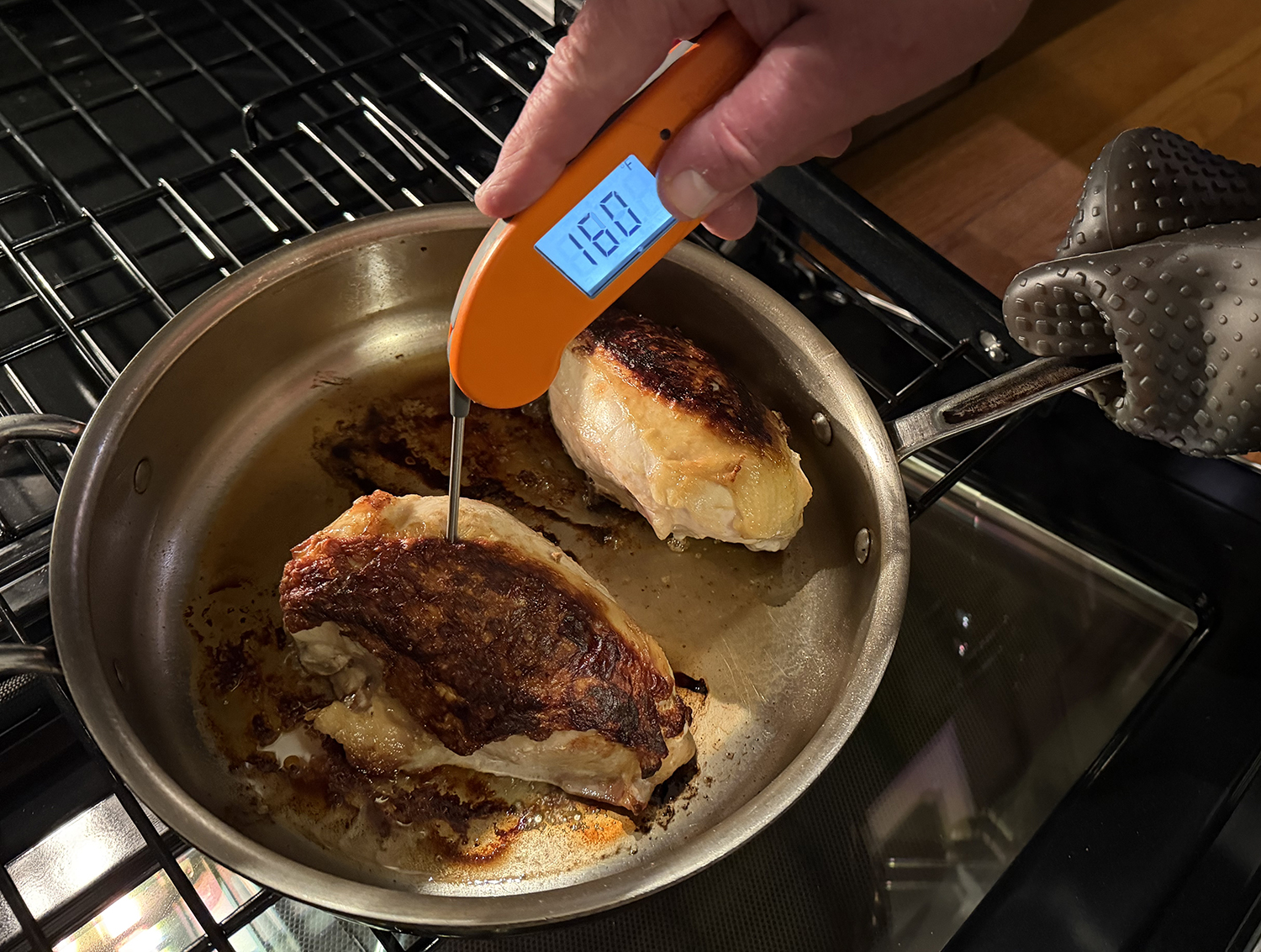 Finishing the chicken in the oven brings it up to temperature gently, so the thinner portions don’t dry out. It is fast and easy to reduce the juices left in the pan, creating a rich fond for the sauce that doesn’t require boxed broth.