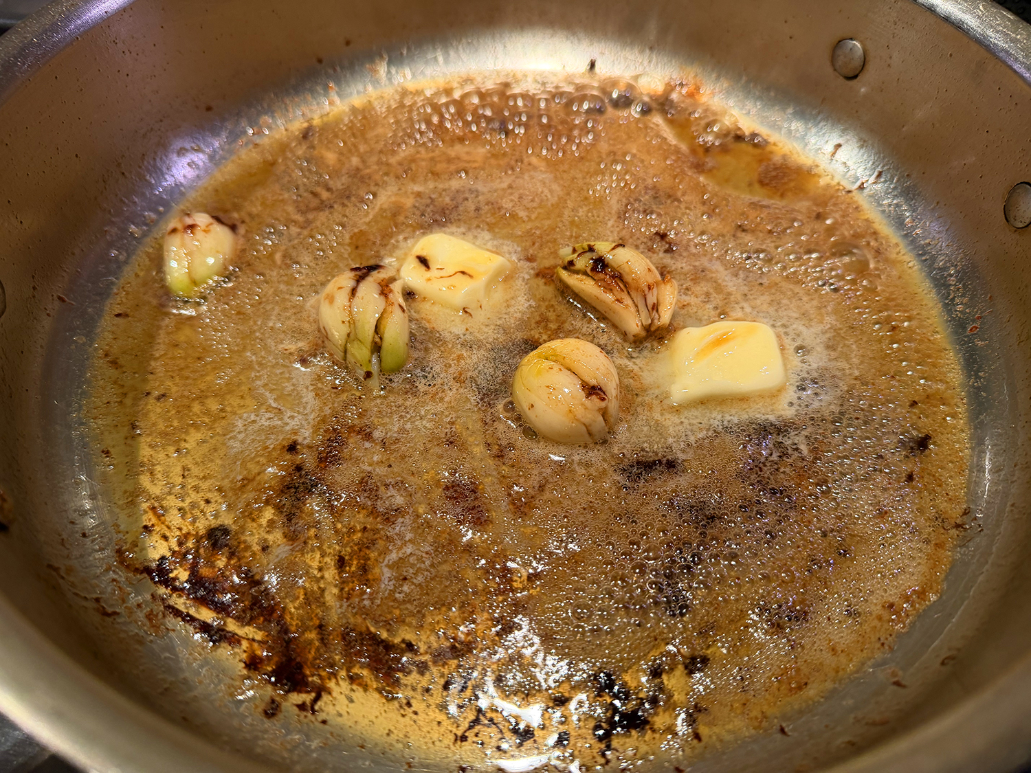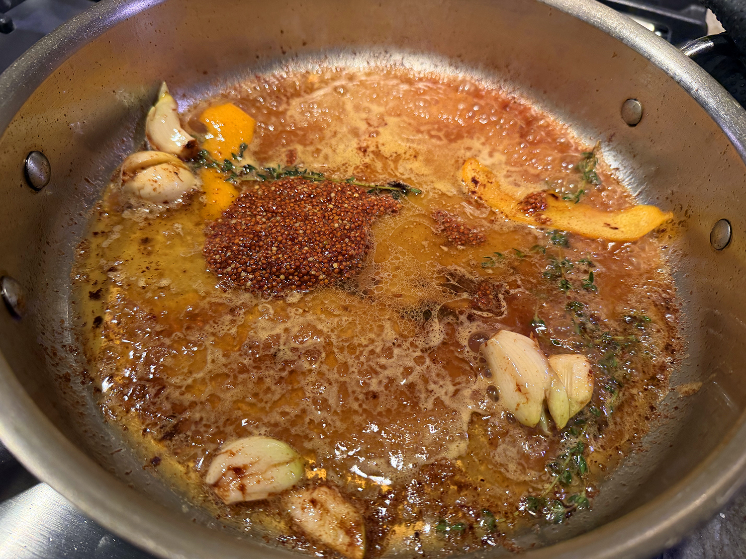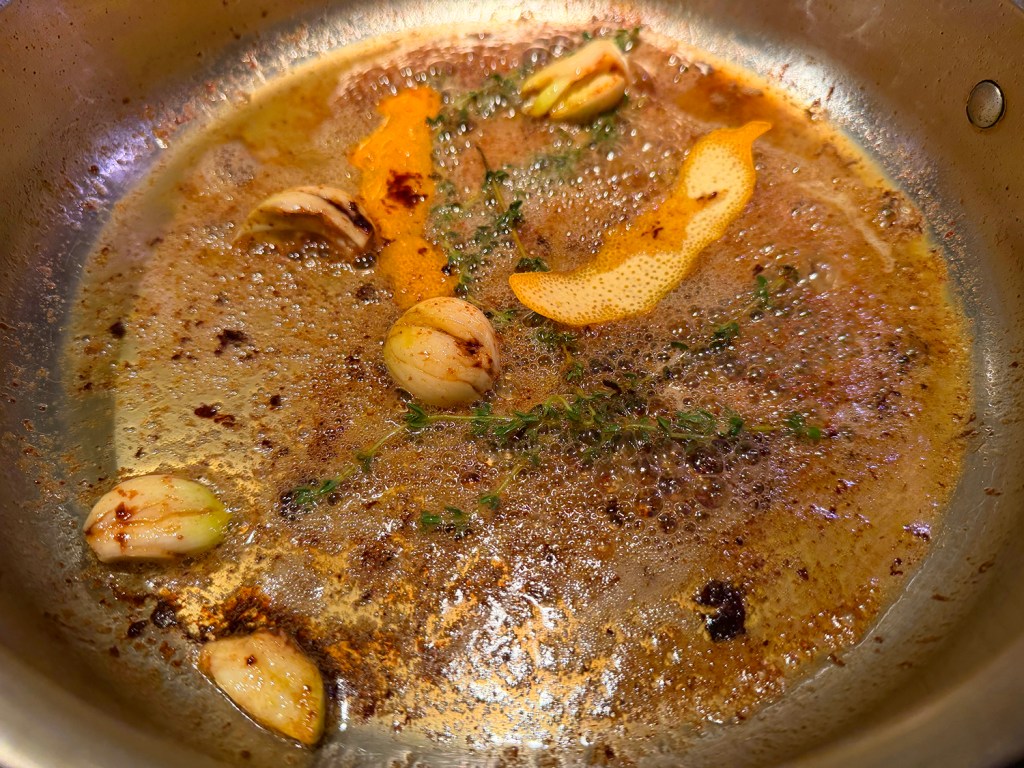 - Transfer chicken to plate skin side up. Place skillet over medium heat and cook, stirring occasionally, until juices in skillet form dark fond, about 1 minute. Add 4 tablespoons unsalted butter and 4 smashed and peeled garlic cloves and cook, stirring constantly, until butter is fully melted, about 1 minute. Add 2 (3-inch) strips orange zest and 5 sprigs thyme and cook, stirring constantly until fragrant, about 20 seconds.
