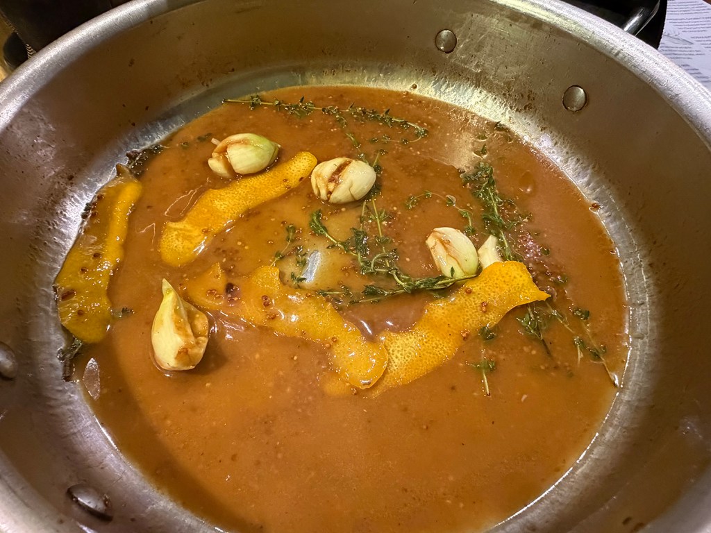 - Stir in ¼ cup orange juice and 1½ tablespoons whole-grain mustard. Off heat, add remaining 2 (3-inch) strips orange zest and 5 sprigs thyme. Season with salt and pepper to taste.