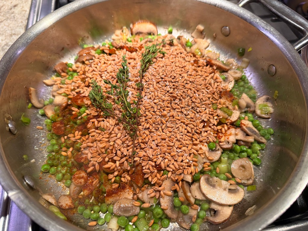 1. In a deep skillet with a lid, heat 2 tablespoons of olive oil over medium-high heat. Add green onions, mushrooms, and peas; sauté for 3-4 minutes. Add fresh garlic and stir briefly until fragrant. Now add farro, sweet paprika, thyme, and a little salt and pepper. Cook for 4-5 minutes, stirring regularly.