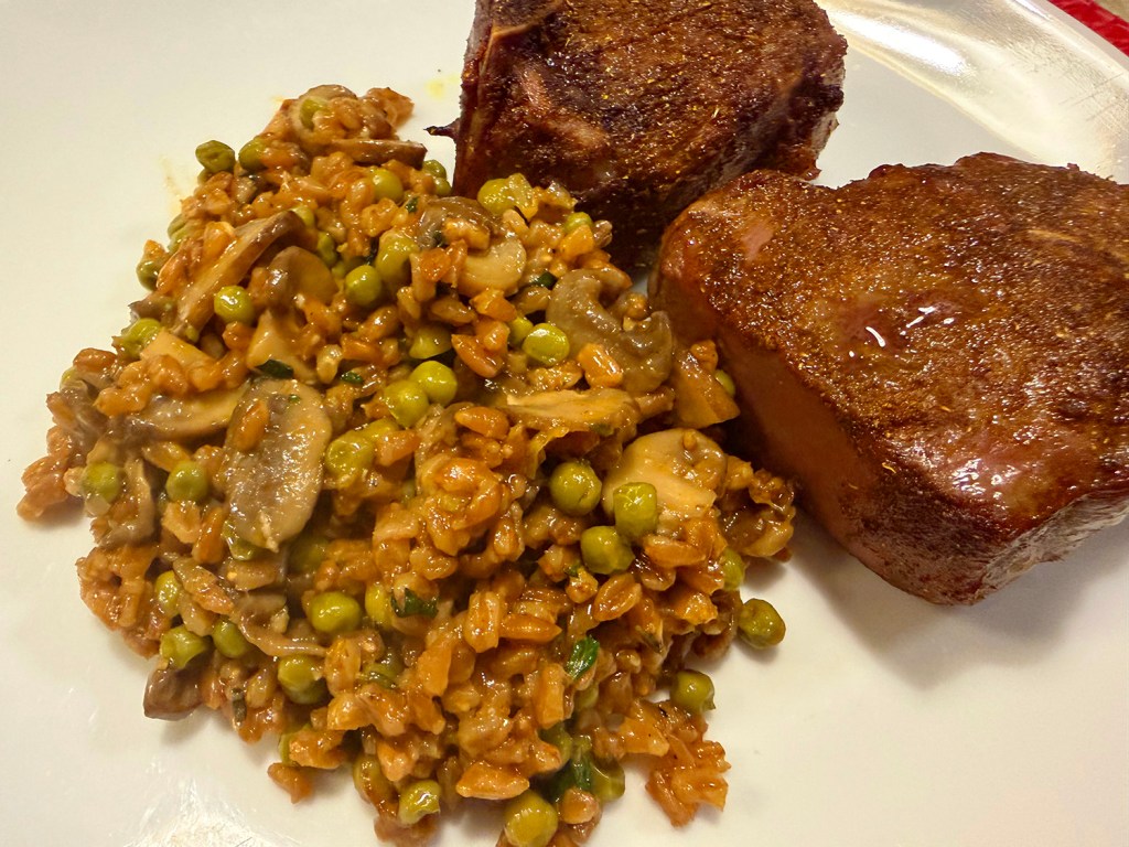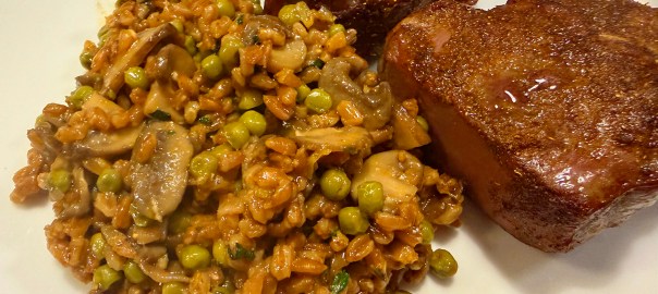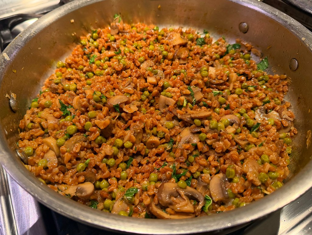 We were pleasantly surprised how much we loved this easy farro recipe with mushrooms and peas. The side dish is creamy and packed with the flavors of fresh thyme, garlic, and a little Parmesan cheese. Think of this as a farro risotto type dish, but with far less TLC than your typical risotto requires!