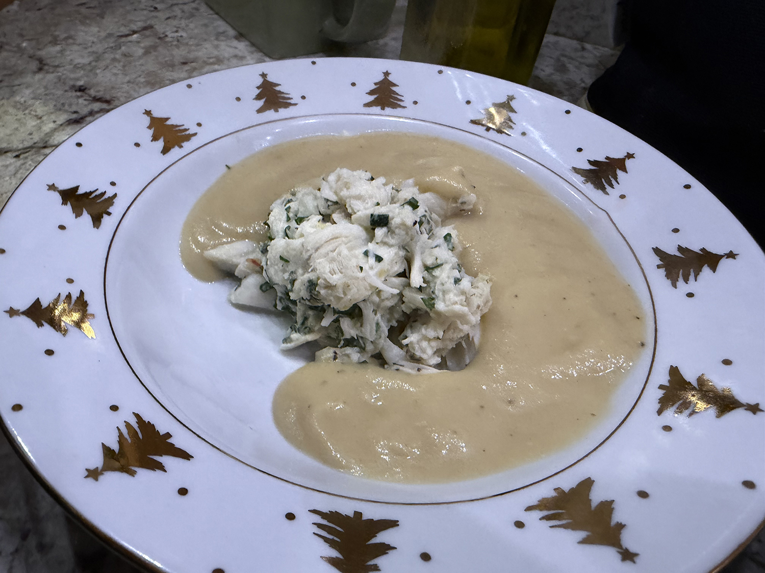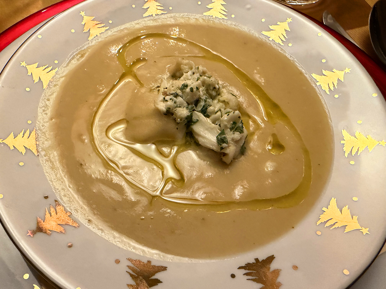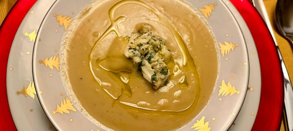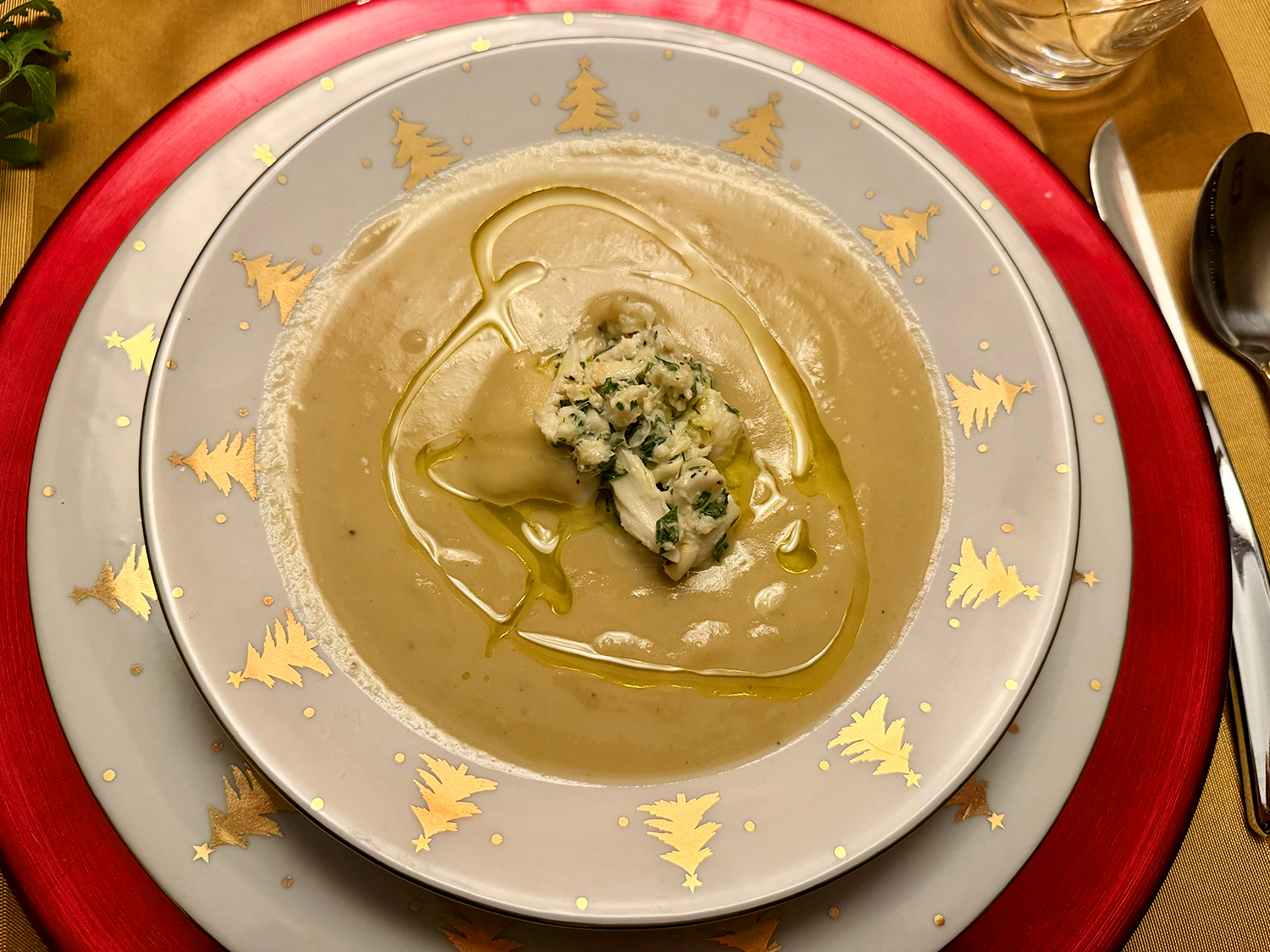 This velvety soup, made with roasted celery root and apple, is finished with a mound of bright and briny crab salad. It’s versatility allows you to serve it as an appetizer, a side for a festive dinner, or simply as a light meal with slice of crusty bread.